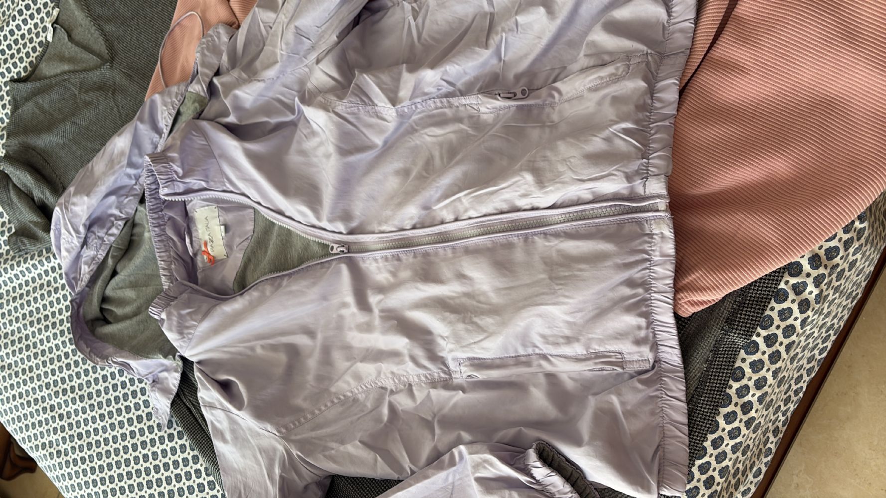 Descrizione:Colore lilla chiaro e foderato in cotone grigio, con cappuccio e collo che si chiude alto.