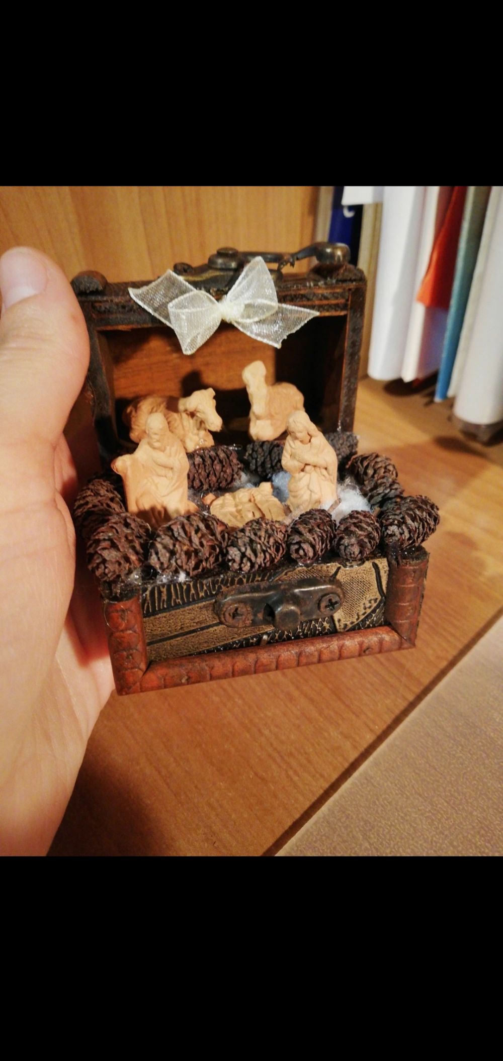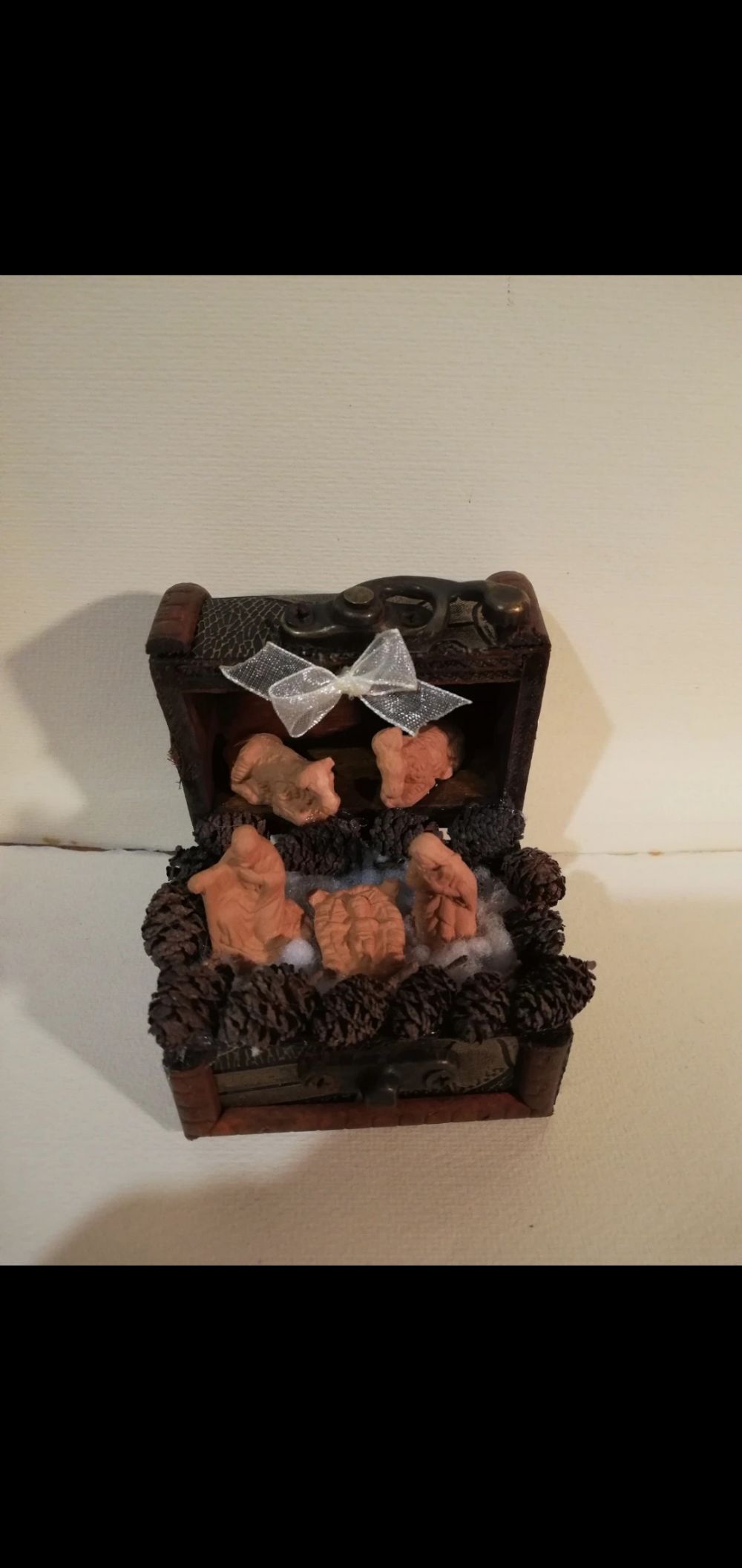 Mini Natività in terracotta handmade all'interno di un bauletto di legno. Misure bauletto 6,5x4,5 cm. Altezza 7 cm.