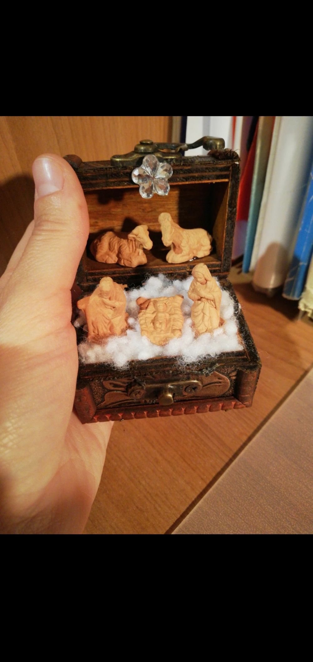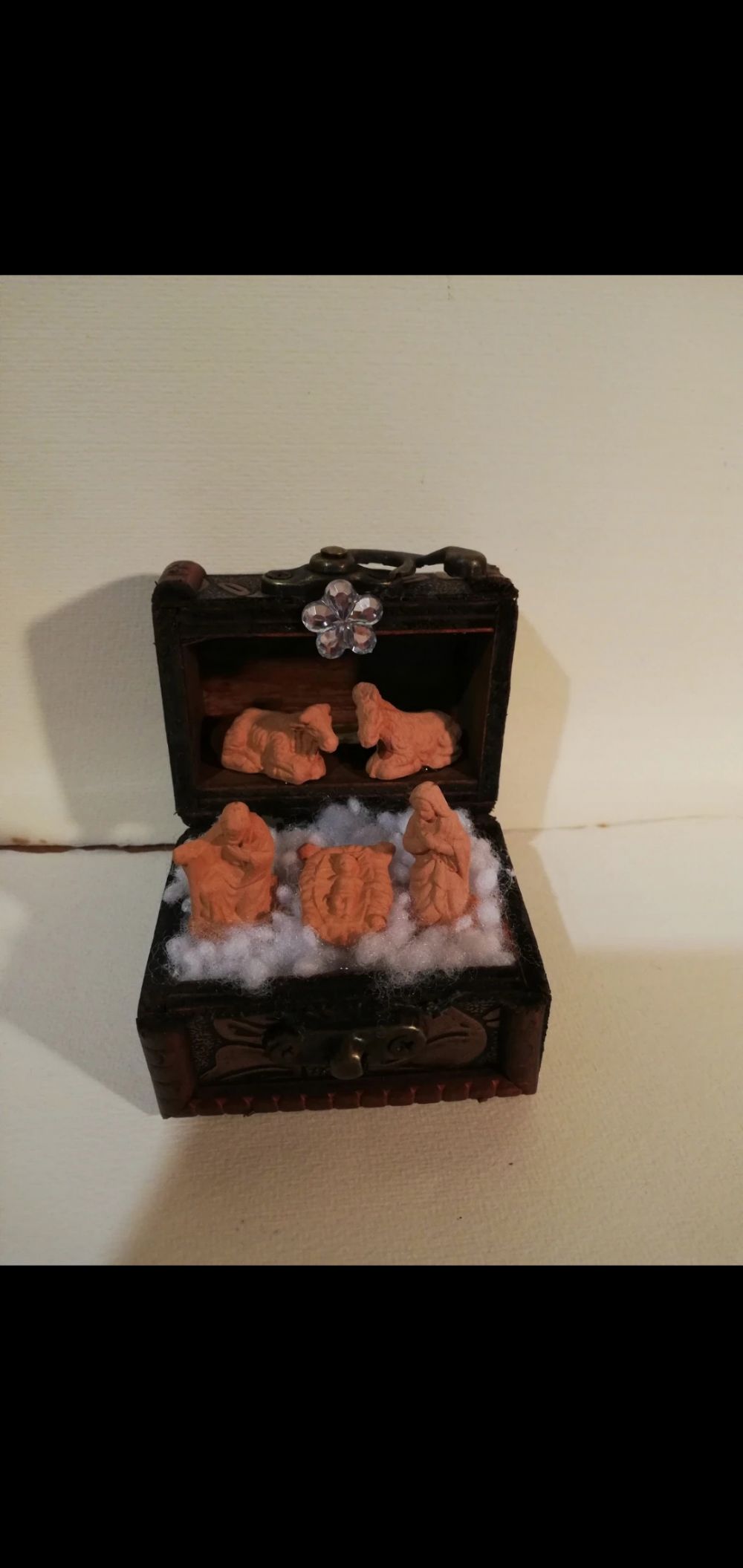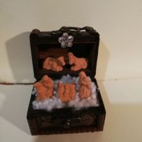 Mini Natività in terracotta handmade all'interno di un bauletto di legno. Misure bauletto 6,5x4,5 cm. Altezza 7 cm.