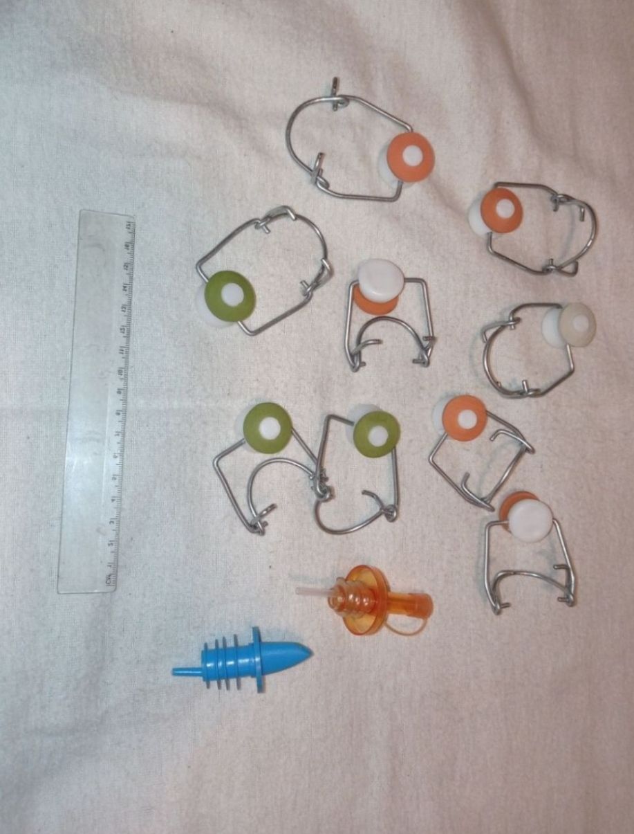 Descrizione:Lotto di 11 tappi, composto da 9 macchinette per pintoni/bottiglie di vetro e altri 2 tappi dosatori di plastica.