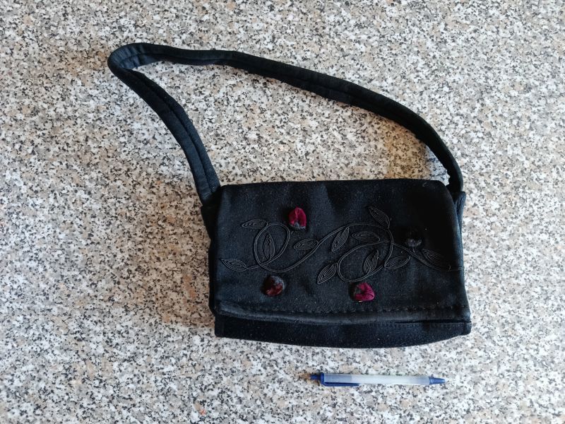 Piccola borsetta scura, non conosco il materiale. Penna per proporzioni