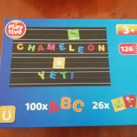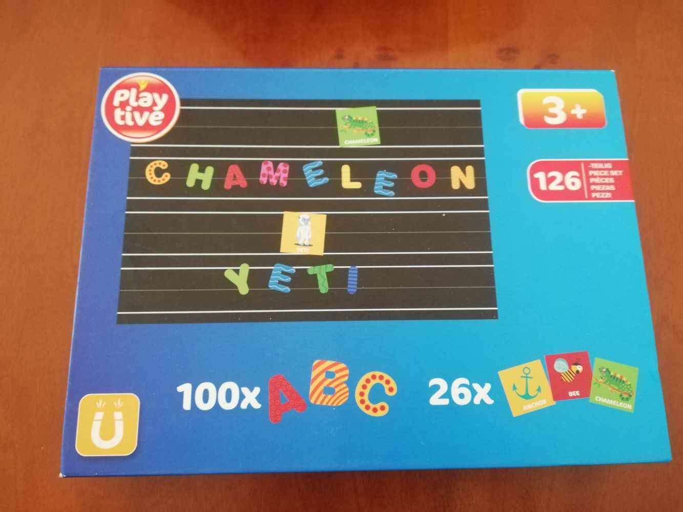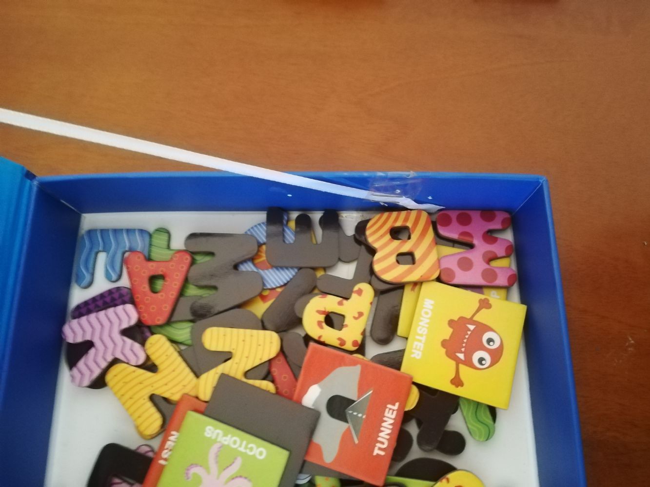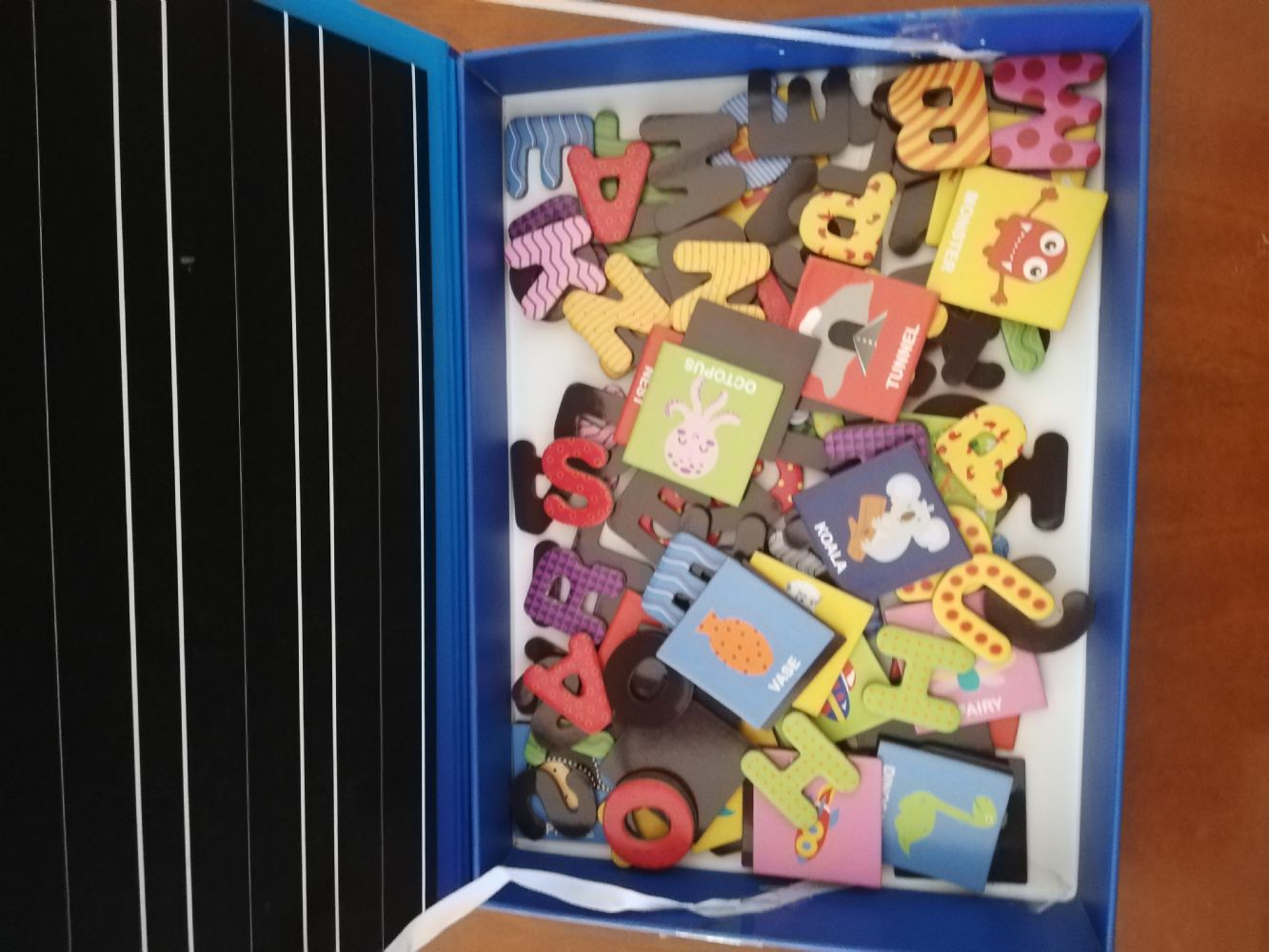 Descrizione:Gioco magnetico lettere e tessere scritte in inglese. Misura scatolo 19x26 cm. Completo. Solo un po' di scocht per tenere i laccetti che reggono la lavagnetta.