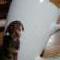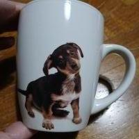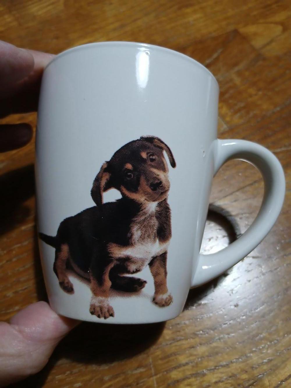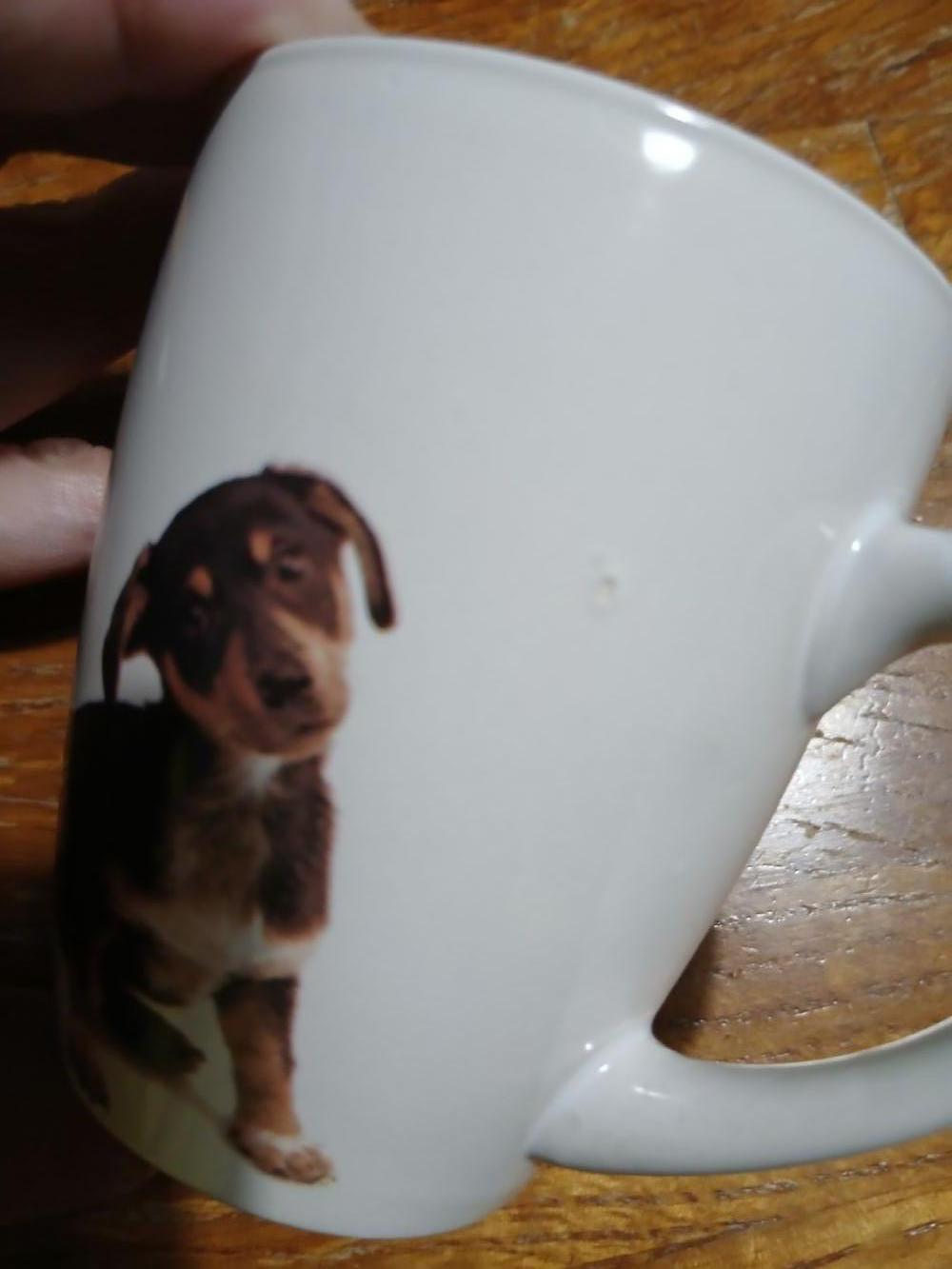In ceramica, il cane è in decalcomania. Altezza 9 cm, diametro in alto 7 cm. In buone condizioni, segnalo un piccolo buchetto vicino al cane ( vedi foto 2).