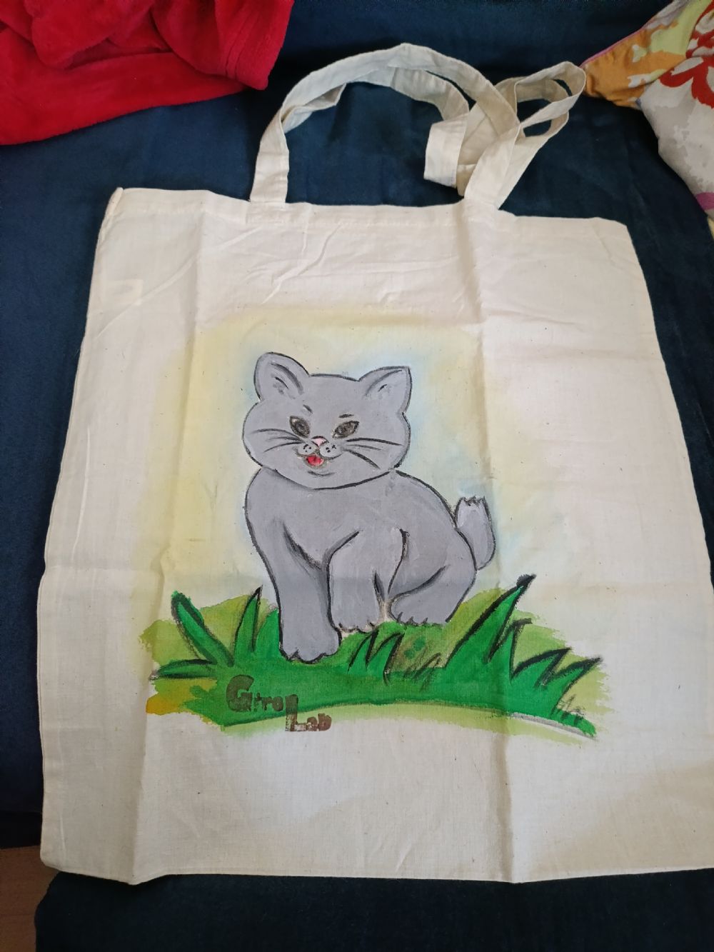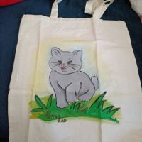Descrizione:Shopper in cotone dipinta a mano, 37x40, lunghezza compresi i manici 73 cm