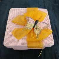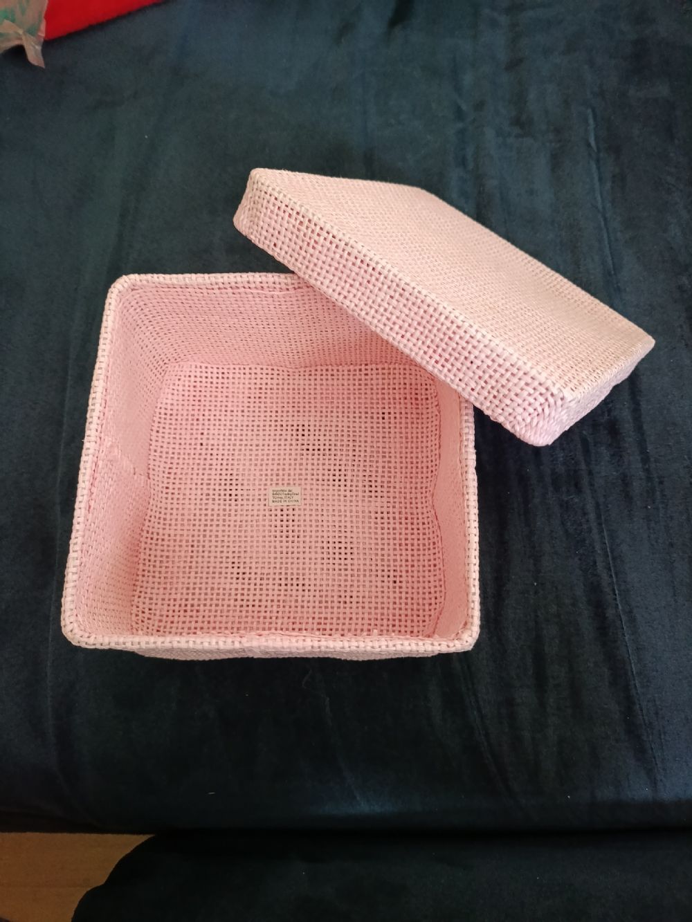 Descrizione:Scatolina con struttura in metallo e rivestimento in tessuto sintetico rigido, decorata con un fiocco rimuovibile. 12,5x12,5x9 cm, nuova, segnalo che la farfalla non è perfetta (vedi foto), si può comunque togliere
