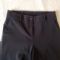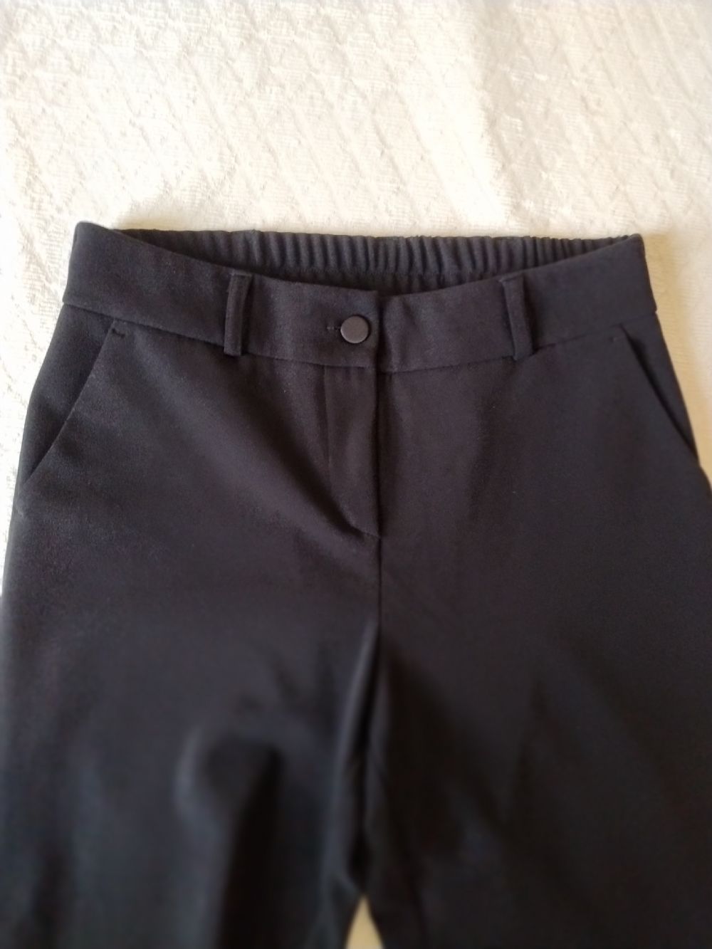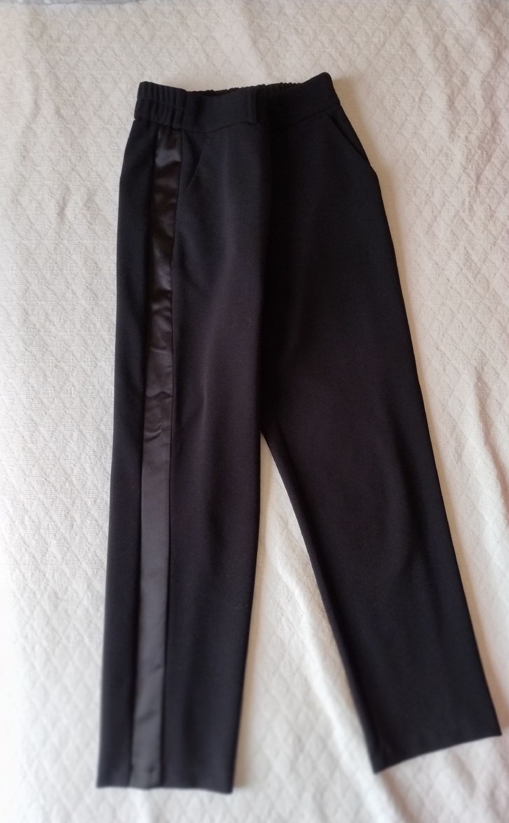 Il bottone è in raso nero come due bande laterali. Taglio leggermente a sigaretta, arriva sopra la caviglia