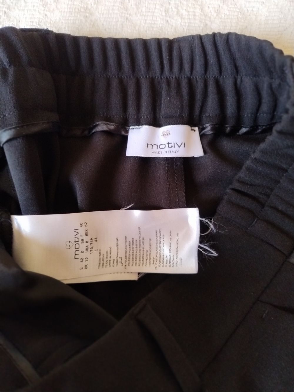 Descrizione:Pantalone nero Motivi, indossato in pochissime occasioni. Tessuto morbido ed elasticizzato con elastico dietro in vita. Taglia 44
