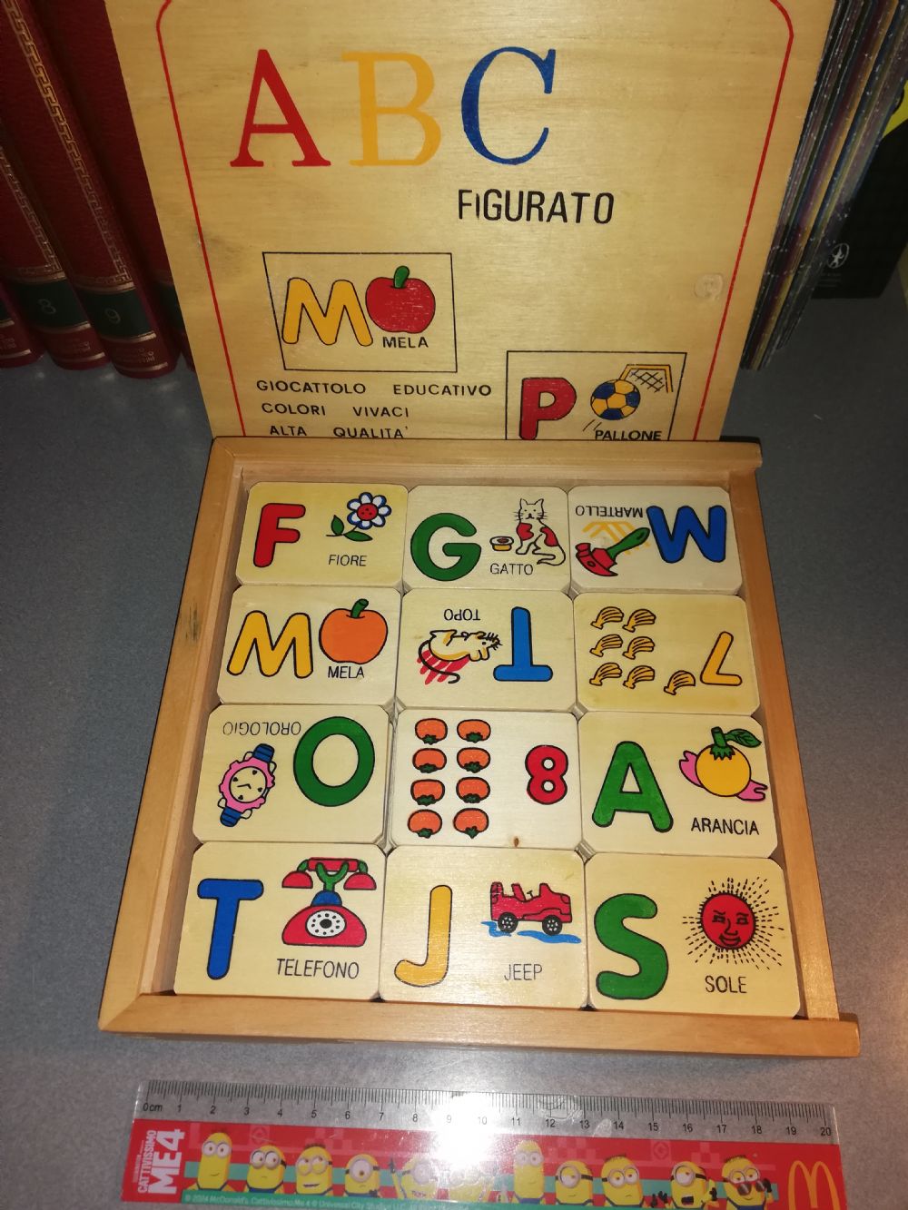 Tessere in legno con immagini e lettere dell''alfabeto. Nonostante sia vintage è ancora in ottime condizioni.