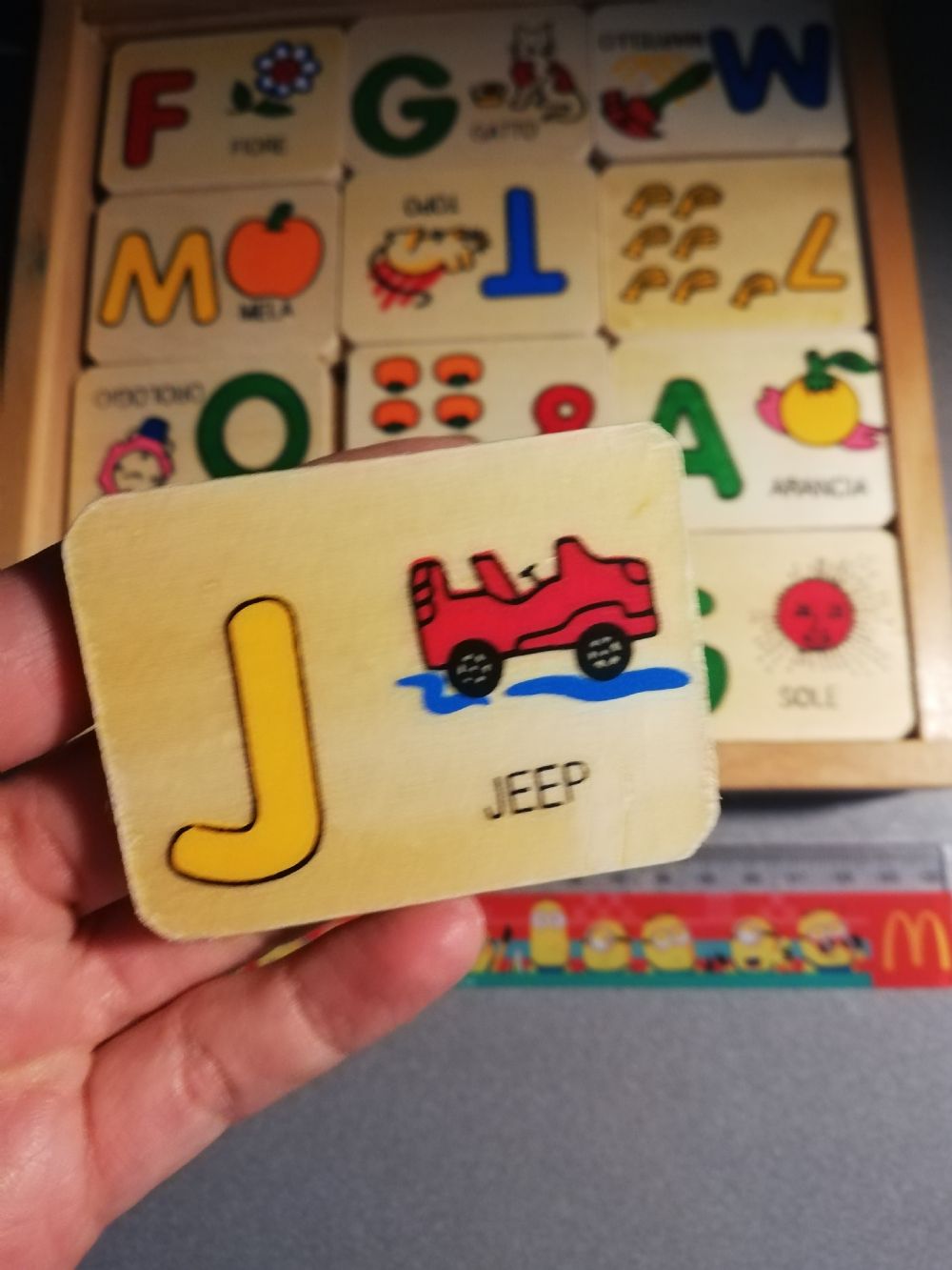 Descrizione:Tessere in legno con immagini e lettere dell'alfabeto. Nonostante sia vintage è ancora in ottime condizioni.