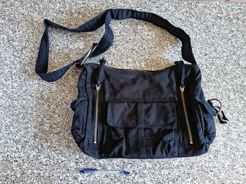 Descrizione:Borsa Carpisa scura, penna per proporzioni.