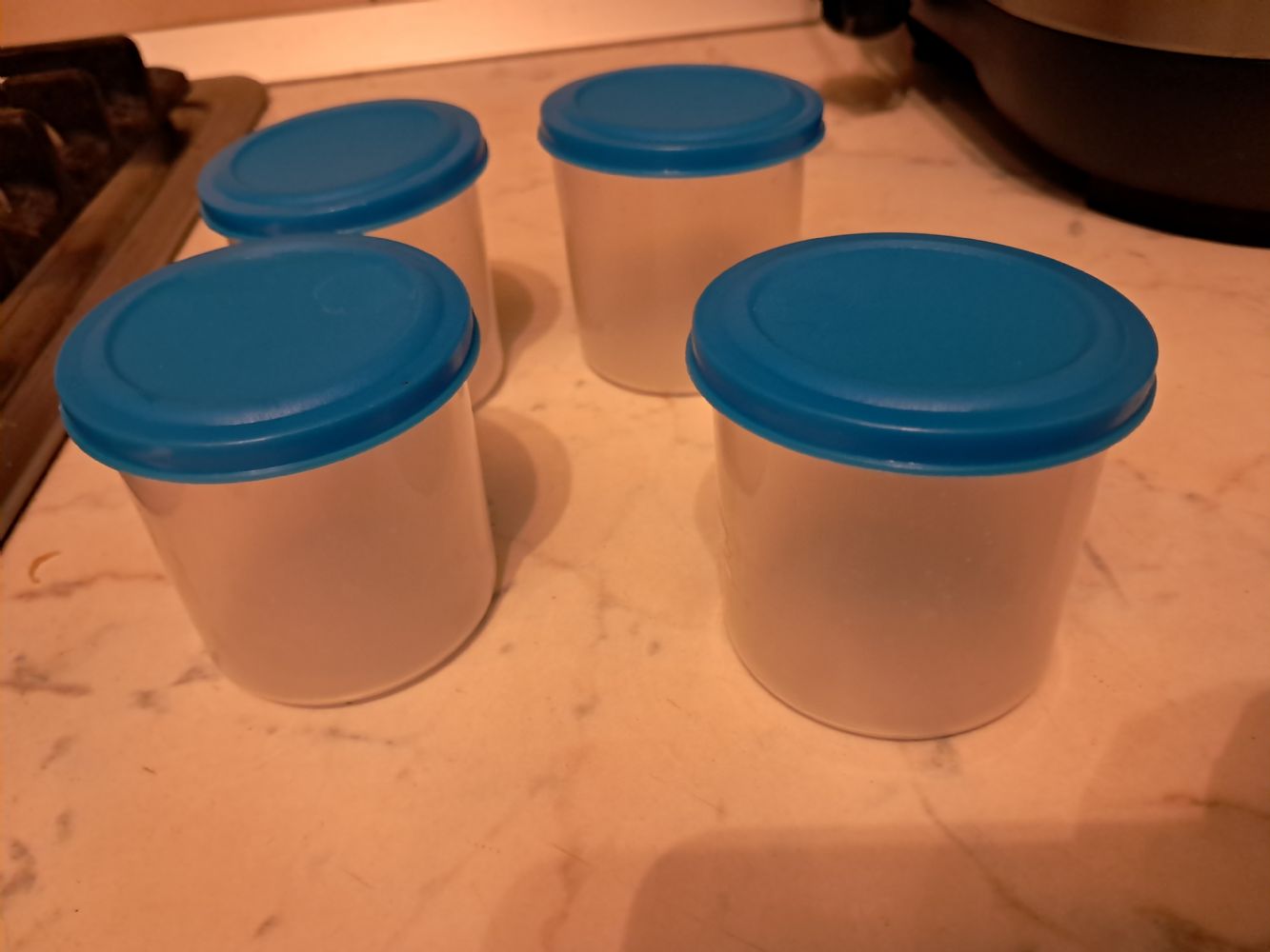 4 contenitori in plastica dura, con coperchio, anche per alimenti, io li ho messi anche in lavastoviglie, misure 5,5 cm altezza e 6 cm diametro. Scambio in blocco