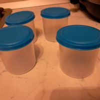 Descrizione:4 contenitori in plastica dura, con coperchio, anche per alimenti, io li ho messi anche in lavastoviglie, misure 5,5 cm altezza e 6 cm diametro. Scambio in blocco