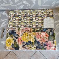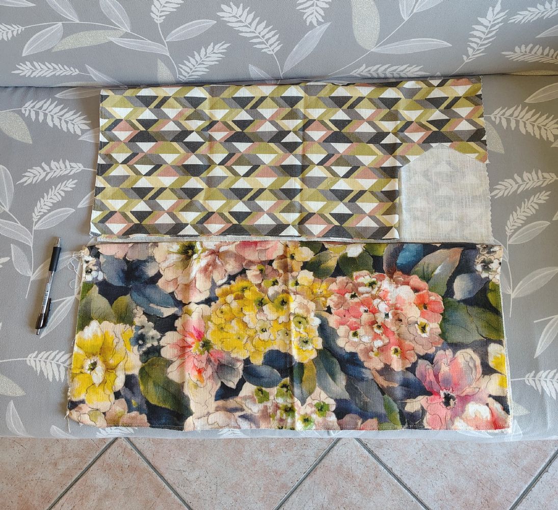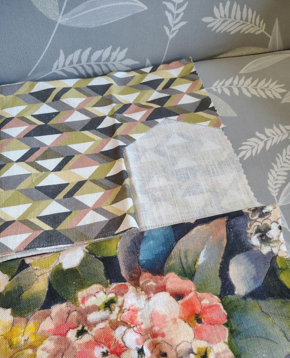 1 con fantasia di motivi geometrici in cotone/lino. Manca un ritaglio (vedi foto)
