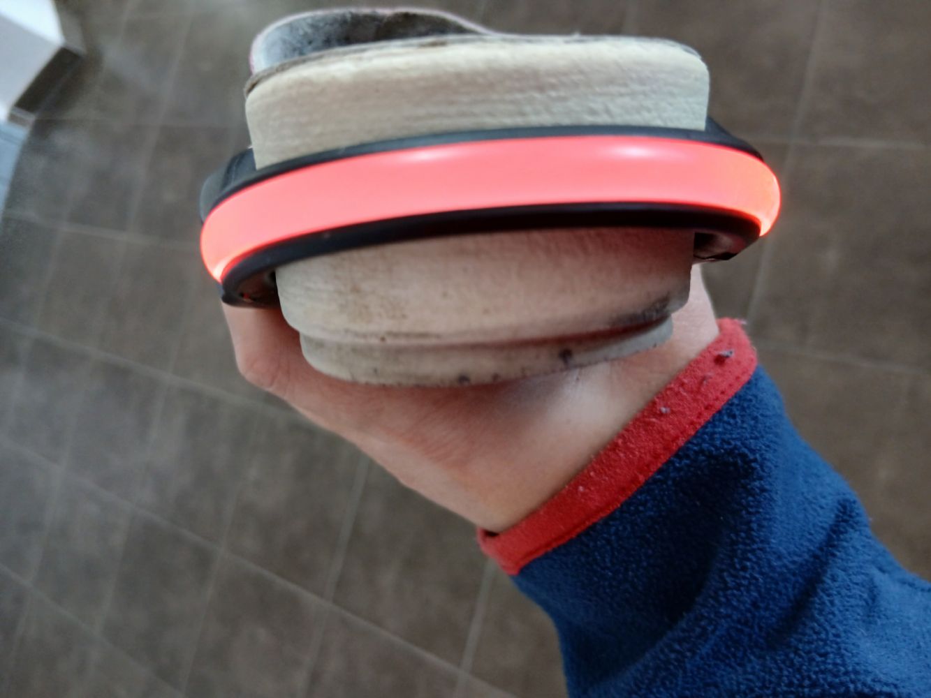 Ciao. A pile . Ha un bottone x accendere di fianco e sta su " a pressione '..così lo metti in più scarpe