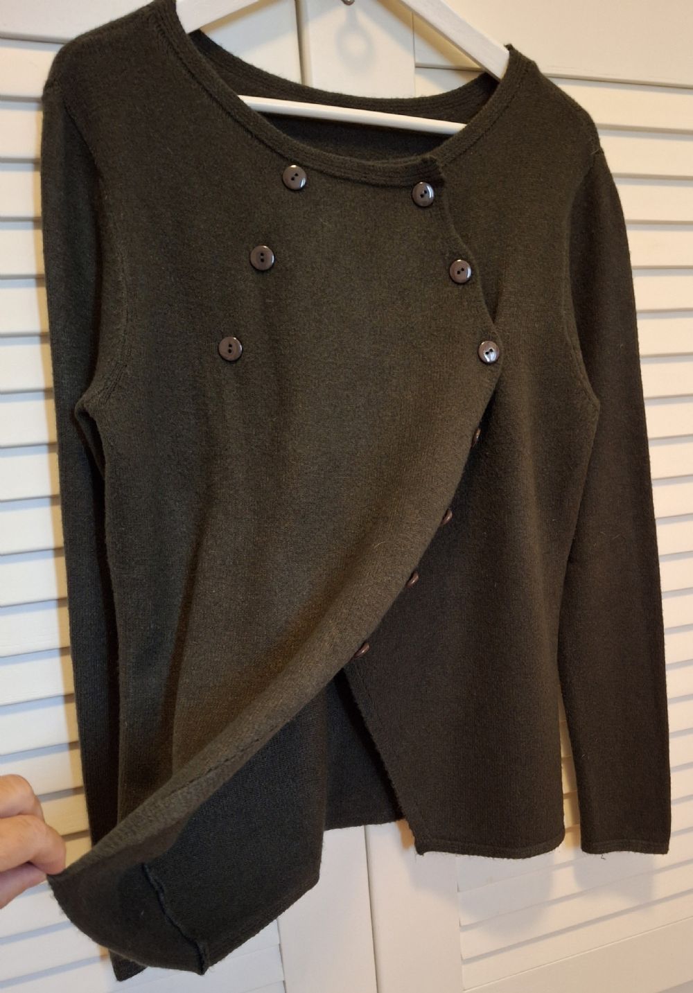 Bel modello a doppio petto chiuso con bottoni nella parte alta, gli altri bottoni sono solo decorativi.