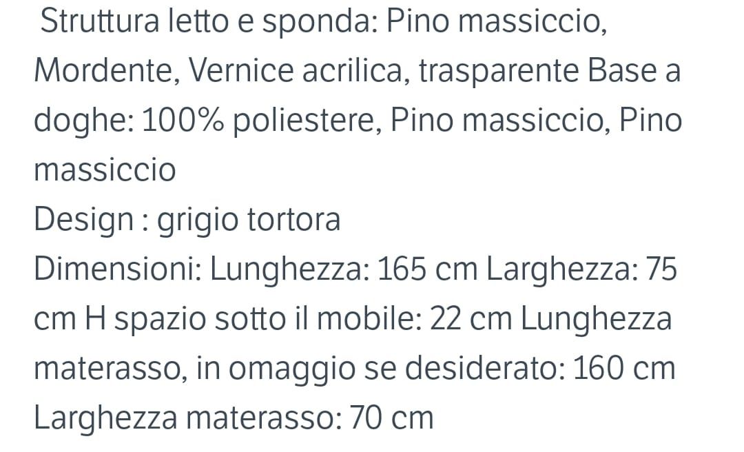 Dimensioni: Lunghezza: 165 cm Larghezza: 75 cm H spazio sotto il mobile: 22 cm Lunghezza materasso, in omaggio se desiderato: 160 cm Larghezza materasso: 70 cm