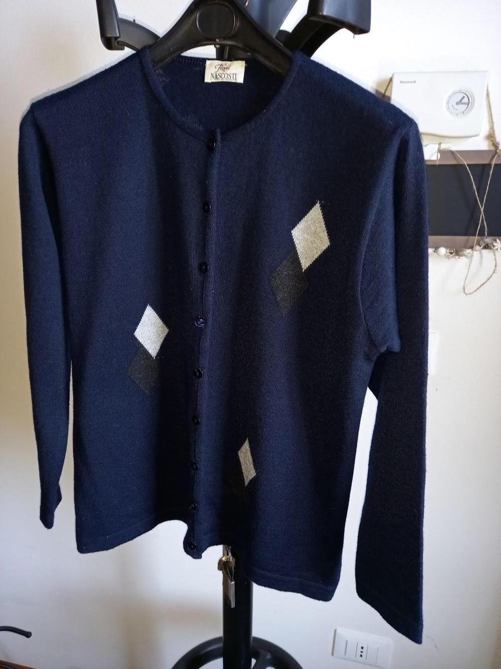 Descrizione:Cardigan Fiori Nascosti, in lana Merino 50%,50 acrilico. È un capo di qualità prodotto in Italia ed è in ottima condizioni. Larghezza spalle cm 41,torace cm 49 circa, lunghezza golf cm 60 circa.