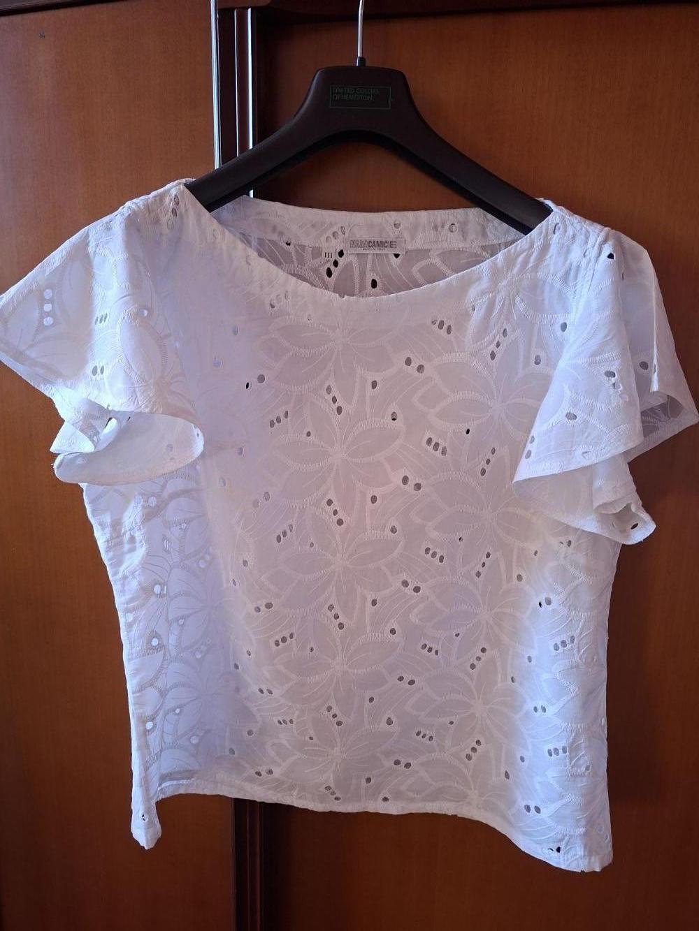 Descrizione:Blusa bianca 100% cotone Sangallo,scollo a barchetta,maniche con volant,marca "Naracamicie ",tg III (M).