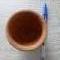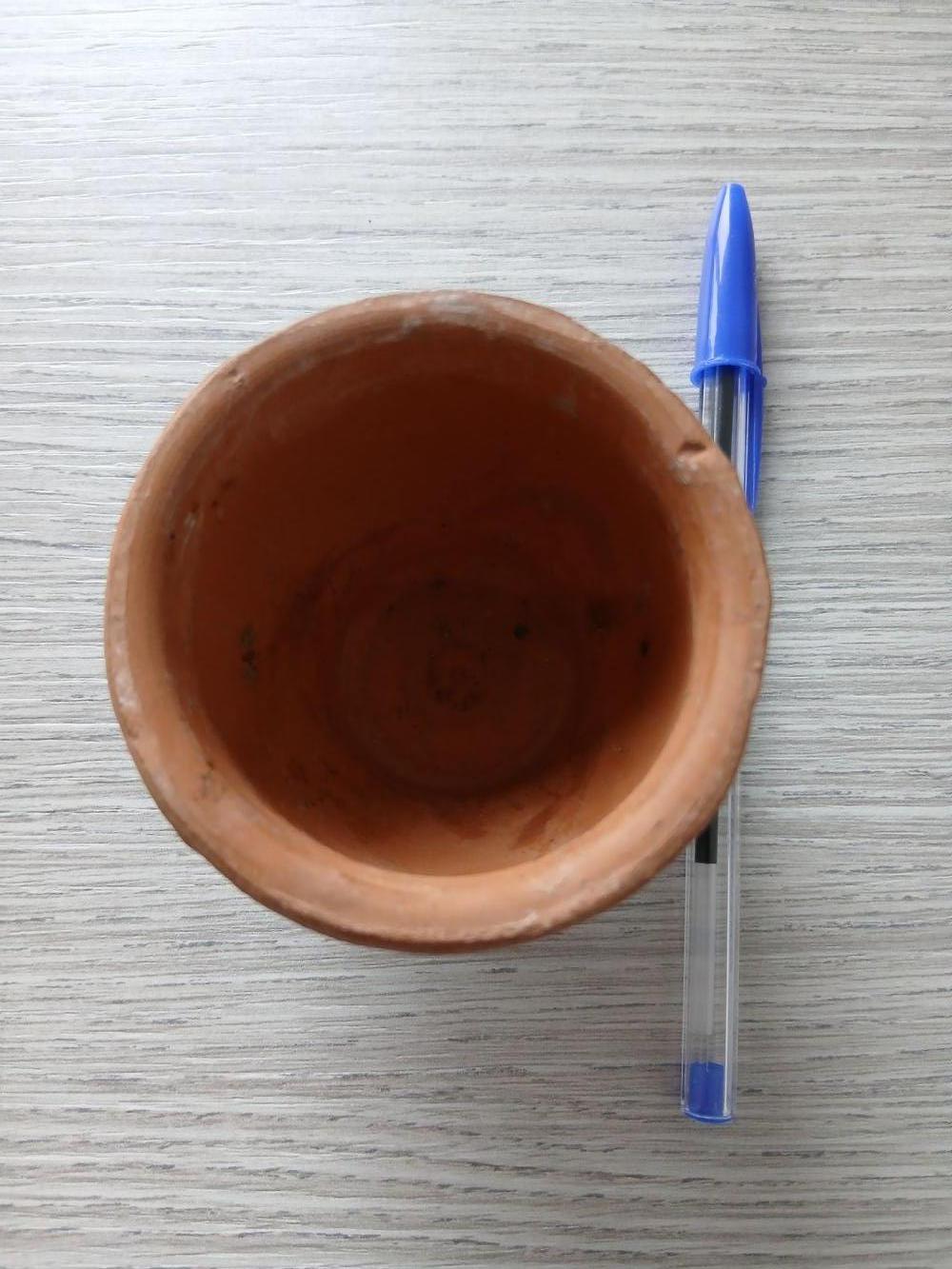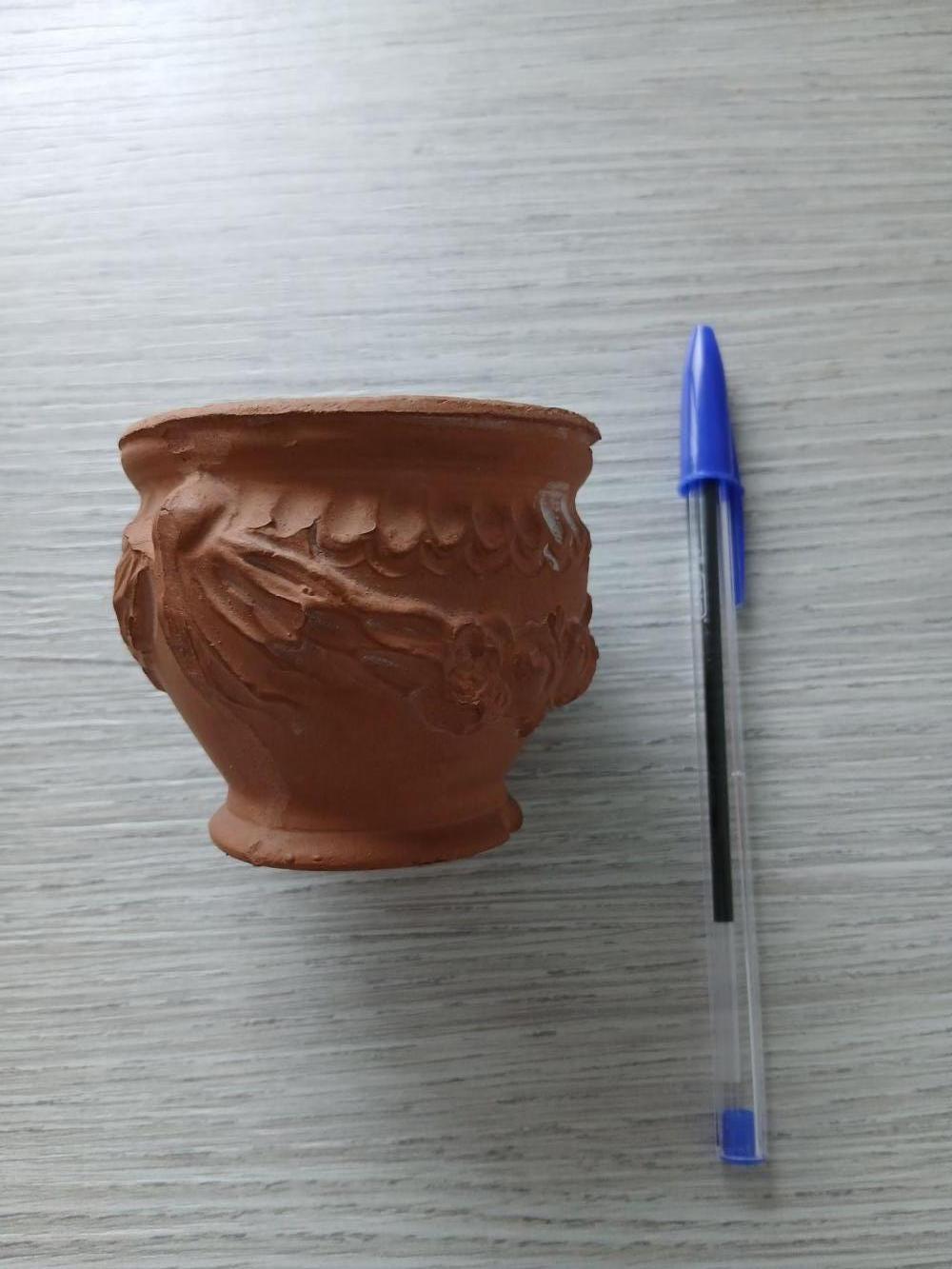 Descrizione:La penna per le dimensioni. Altezza 6,2 cm, diametro utile 6 cm. Colore terracotta ( marrone chiaro), qualche macchiolina bianca da stampo. Decorazione con motivi a festoni.