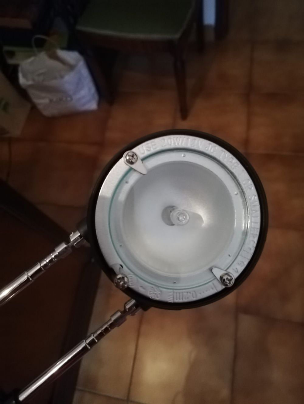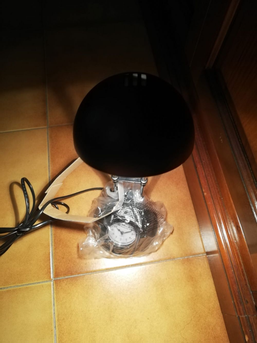 Descrizione:Lampada nera con lampadina alogena da 12 V funzionante come si vede in foto. Asta telescopica, altezza massima 45 cm, l'orologio sveglia alla base funziona con una batteria a bottone (non fornita). Segno usato poco perché ce l'ho da un po' di tempo, ma in realtà non è mai stata usata infatti ancora è impacchettata. La scatola non c'è perché si è rovinata. Per vederla aperta come si vede sbirciate il link.