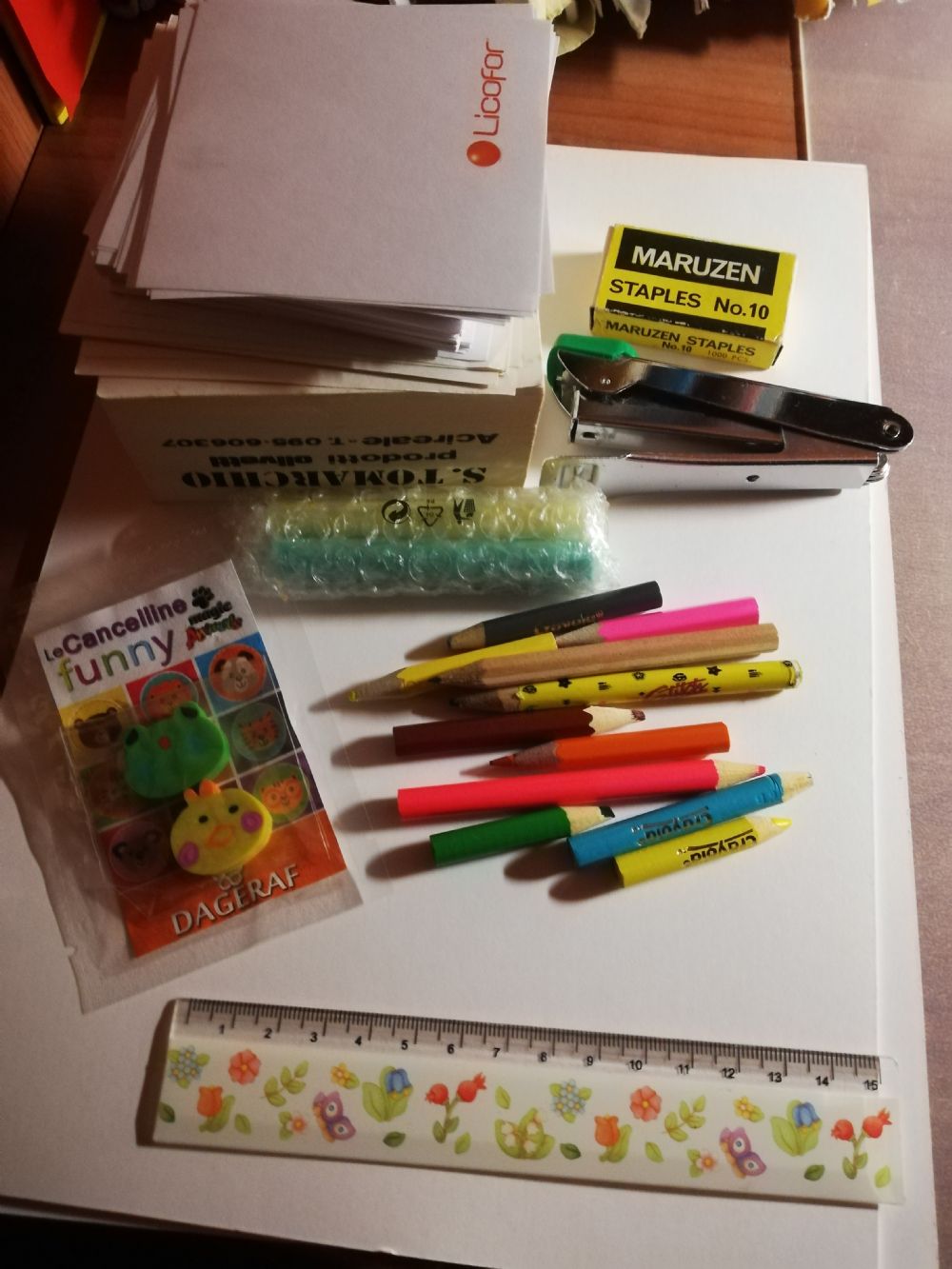 Lotto di gommine da cancellare nuove, blocco di foglietti, matitine, gessetti e cucitrice. Dal nuovo all usato ma ancora sfruttabile.