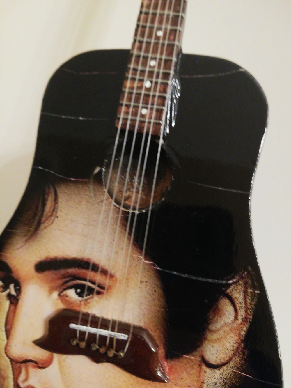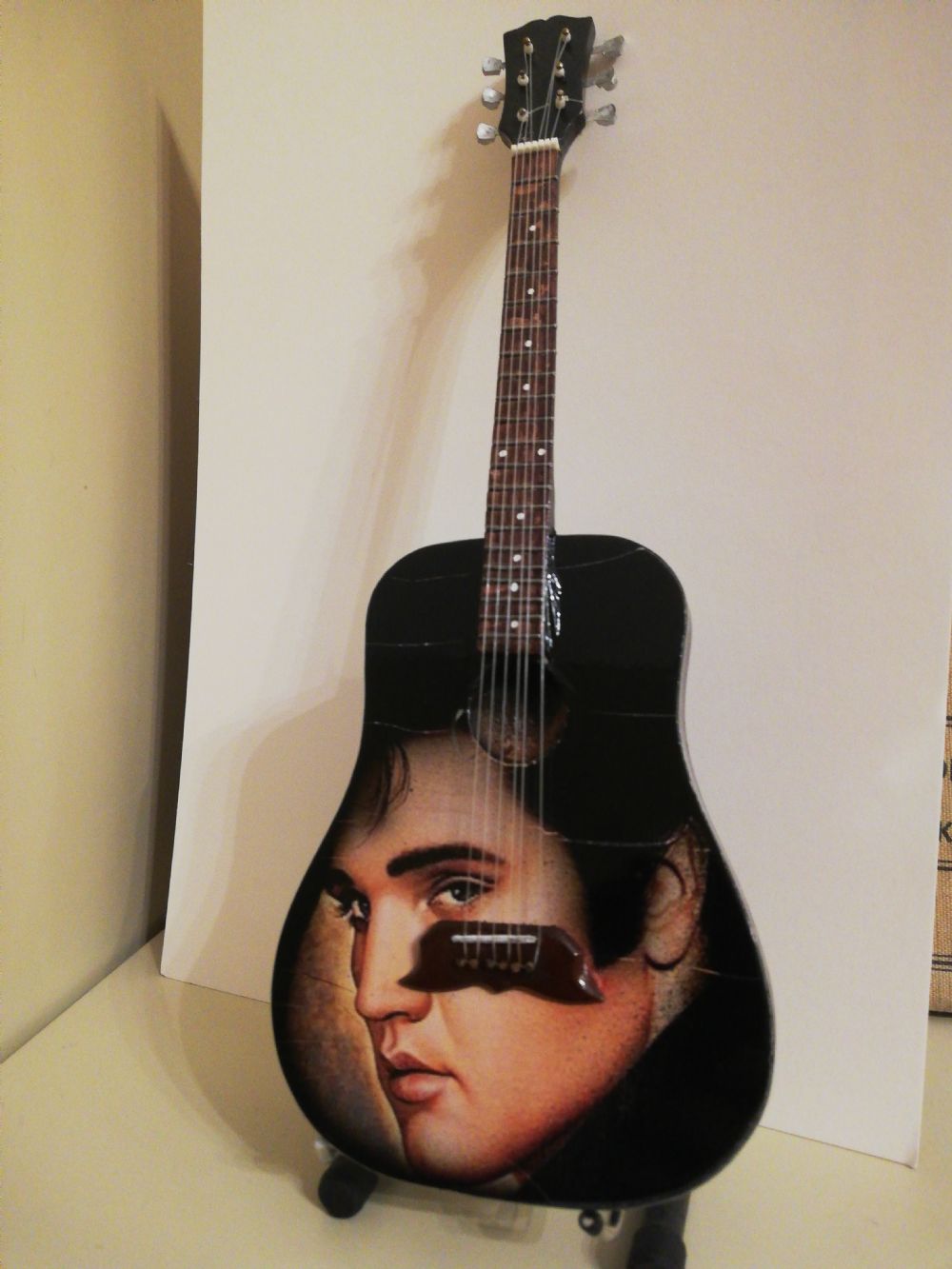 Descrizione:Mini Chitarra tributo Elvis Presley con supporto. In legno. Solo esposta ma gli sbalzi di temperatura l hanno un po' rovinata davanti. Magari riuscite a sistemarla o vi piace così :) per il resto perfetta. altezza chitarra 25 cm