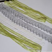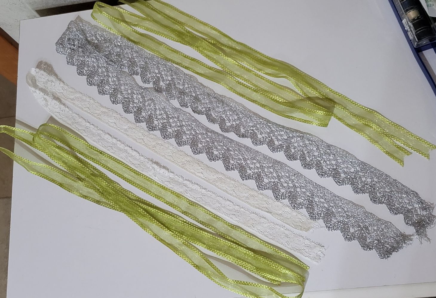 Descrizione:Merletto argentato lunghezza 1 metro,merletto bianco 80 cm.,nastri verdi 154 cm.