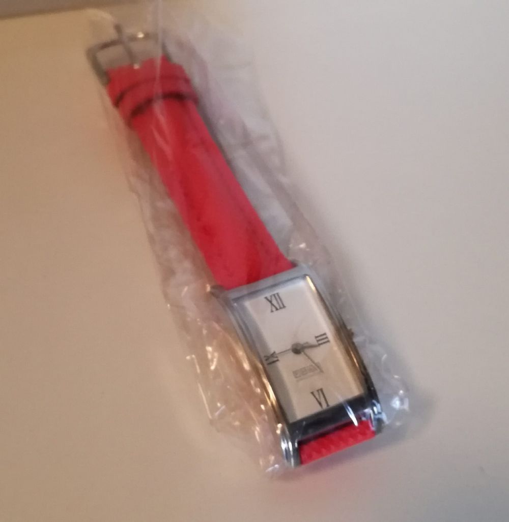 Orologio elegante con cinturino rosso, regalo aziendale nuovo con confezione.