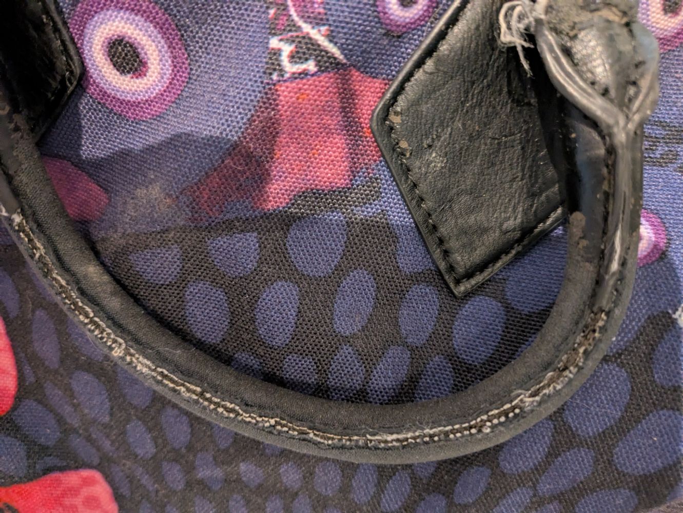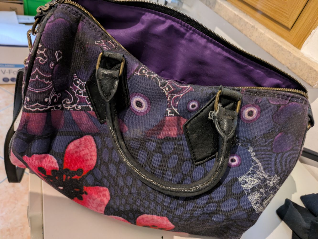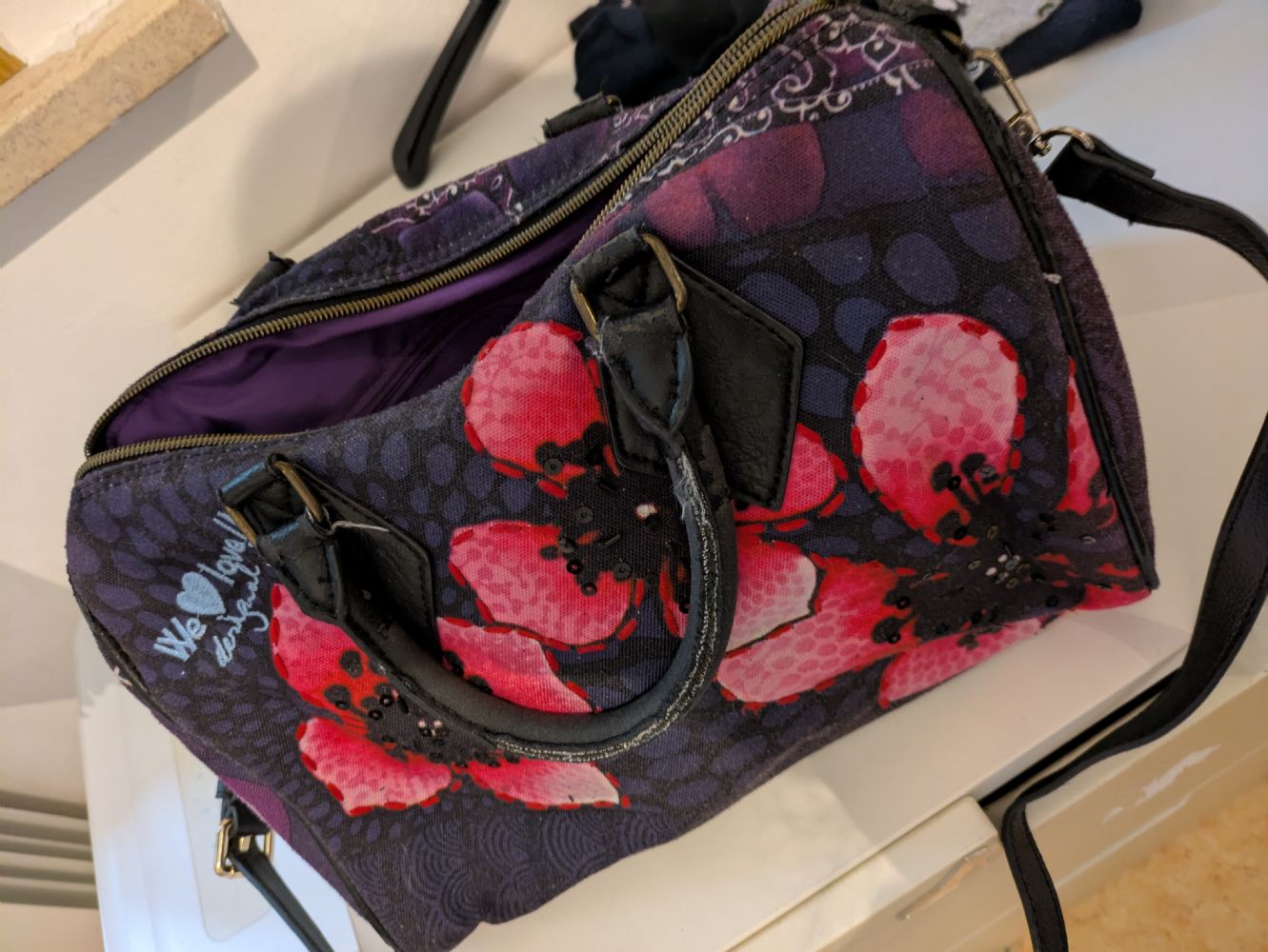 Borsa Desigual cotone da usare a mano o con tracolla, la maniglie e la cintura sono usurate e i bordi in pelle. Misure: 30*22*18 cm
