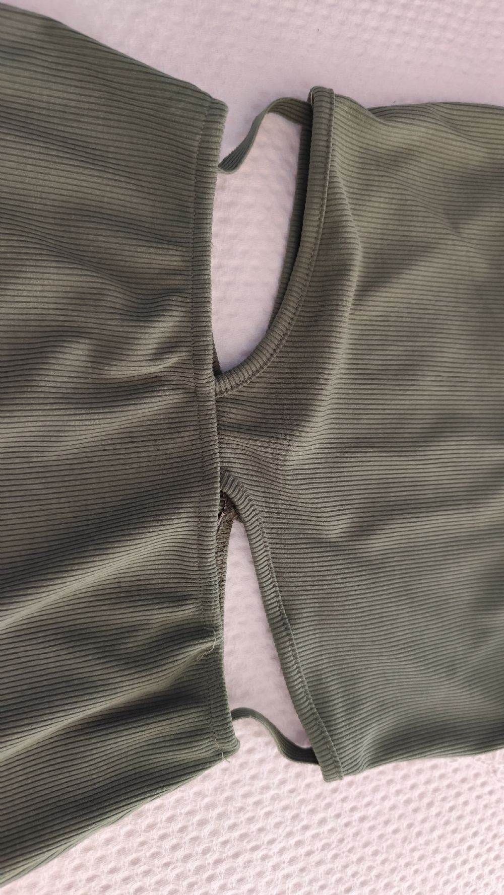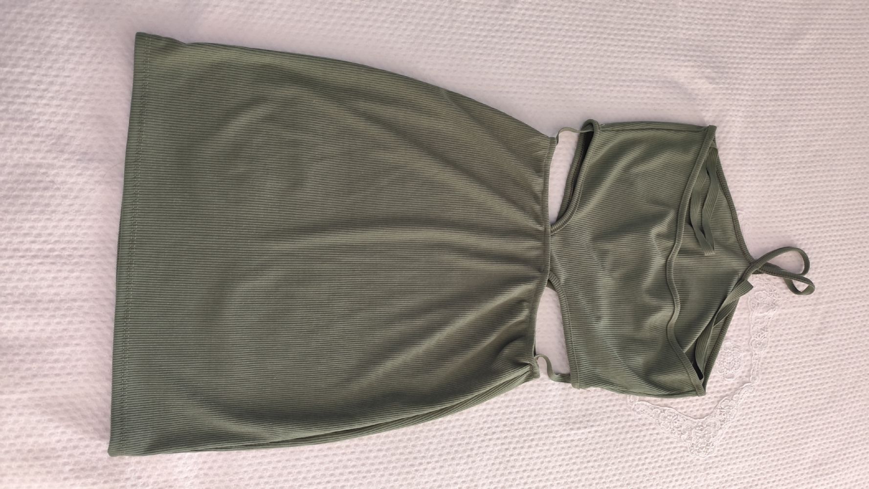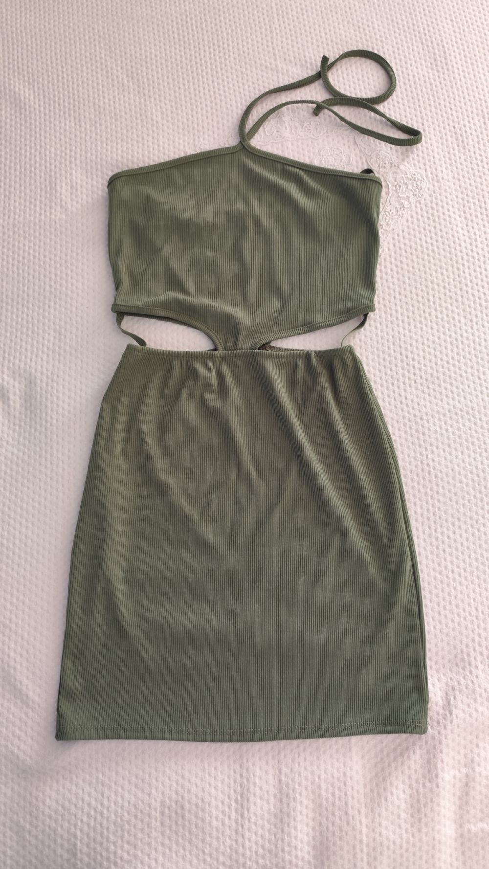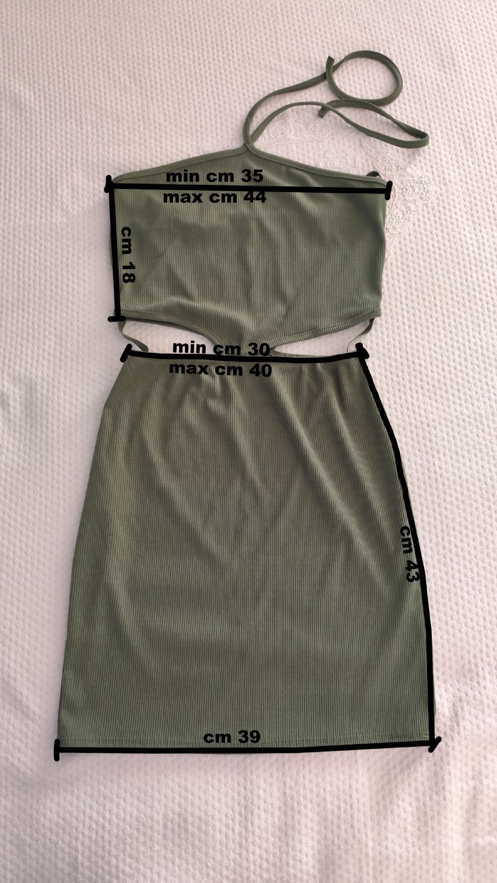 Descrizione:Mini abito in jersey verde cachi, modello aderente, top con scollatura all’americana e corto in vita con aperture sui fianchi e schiena scoperta, gonna corta a tubino. Versatile e sportivo, comodo per creare svariati outfit alla moda, è in perfetto stato senza difetti.
