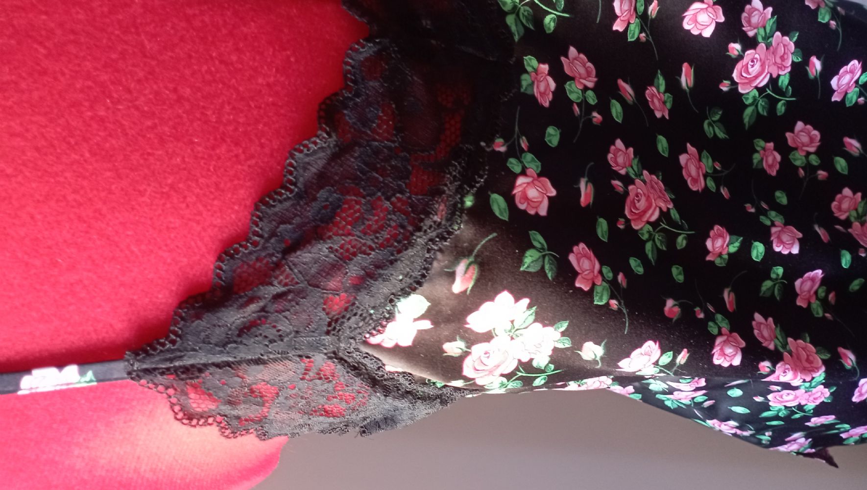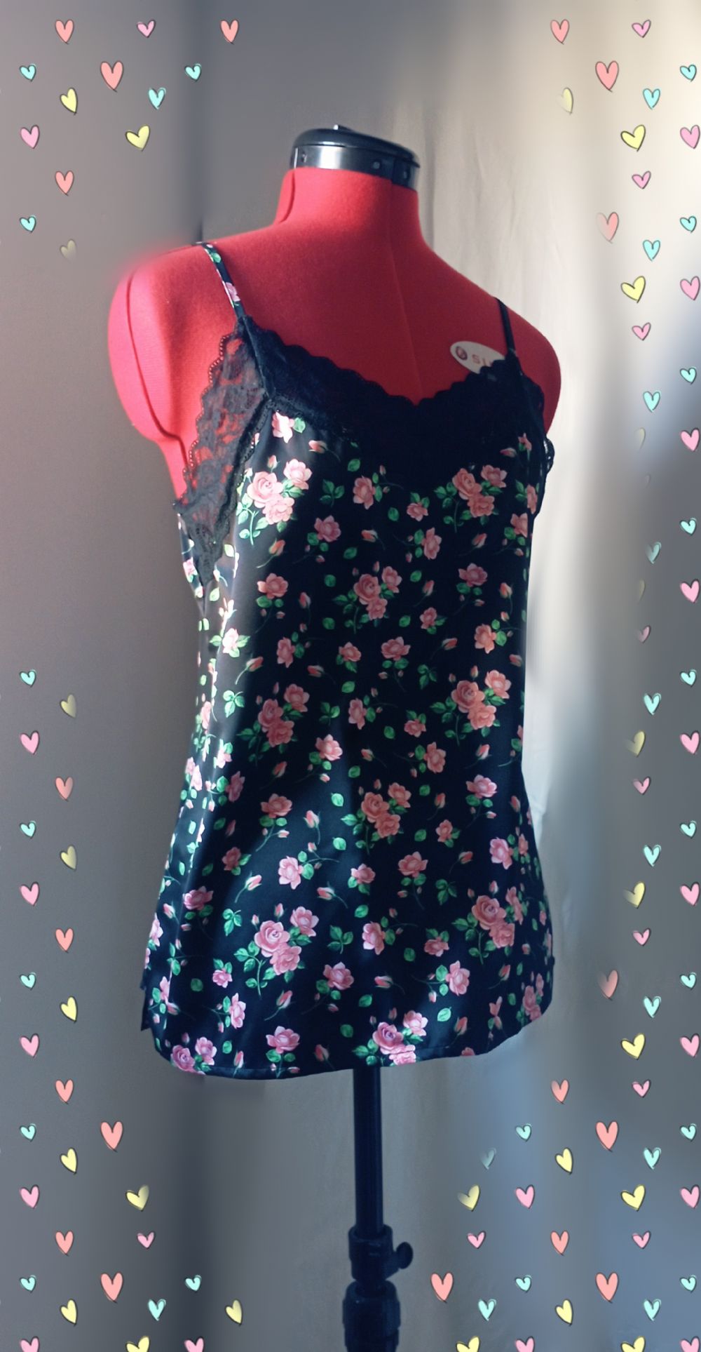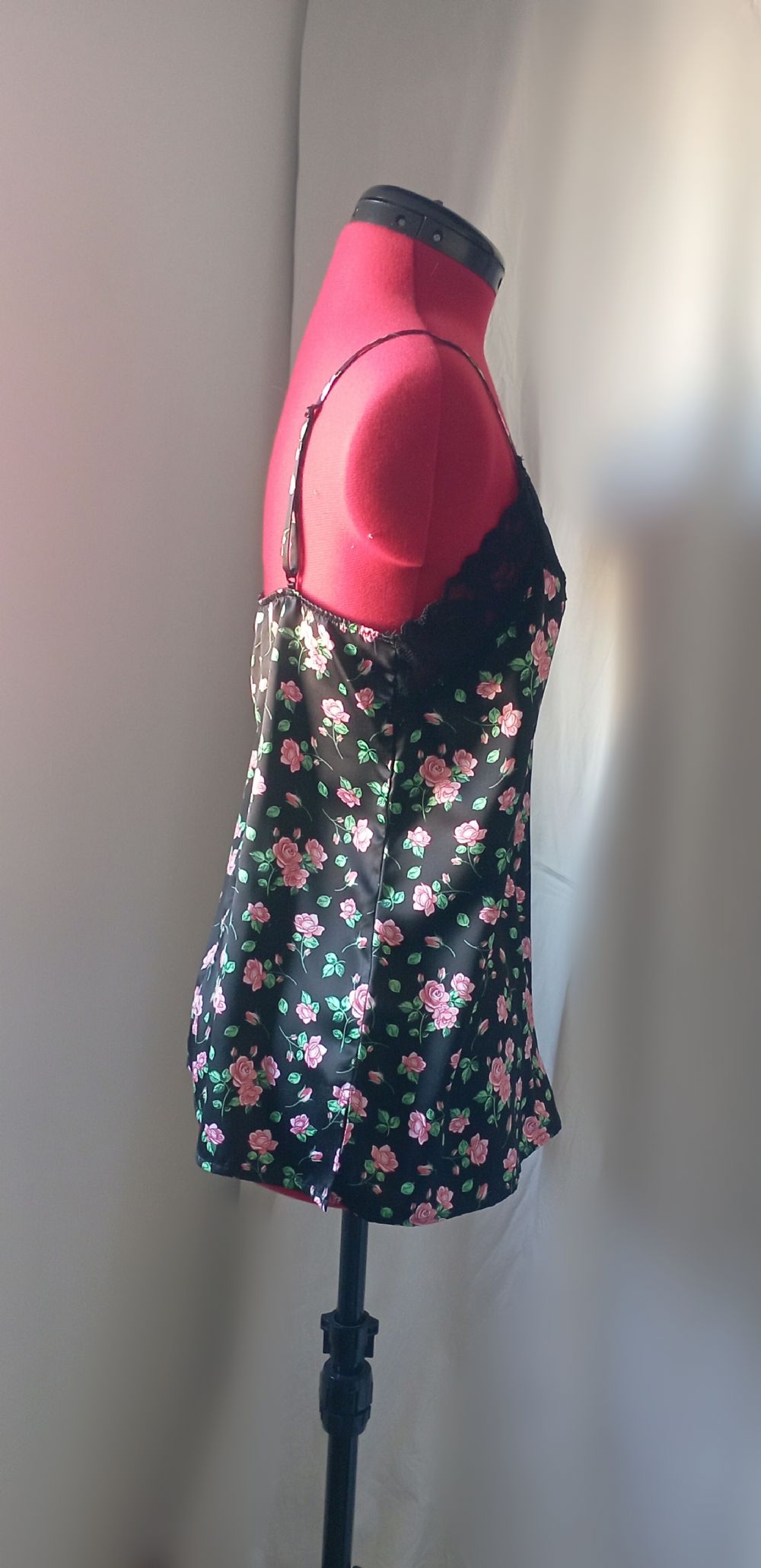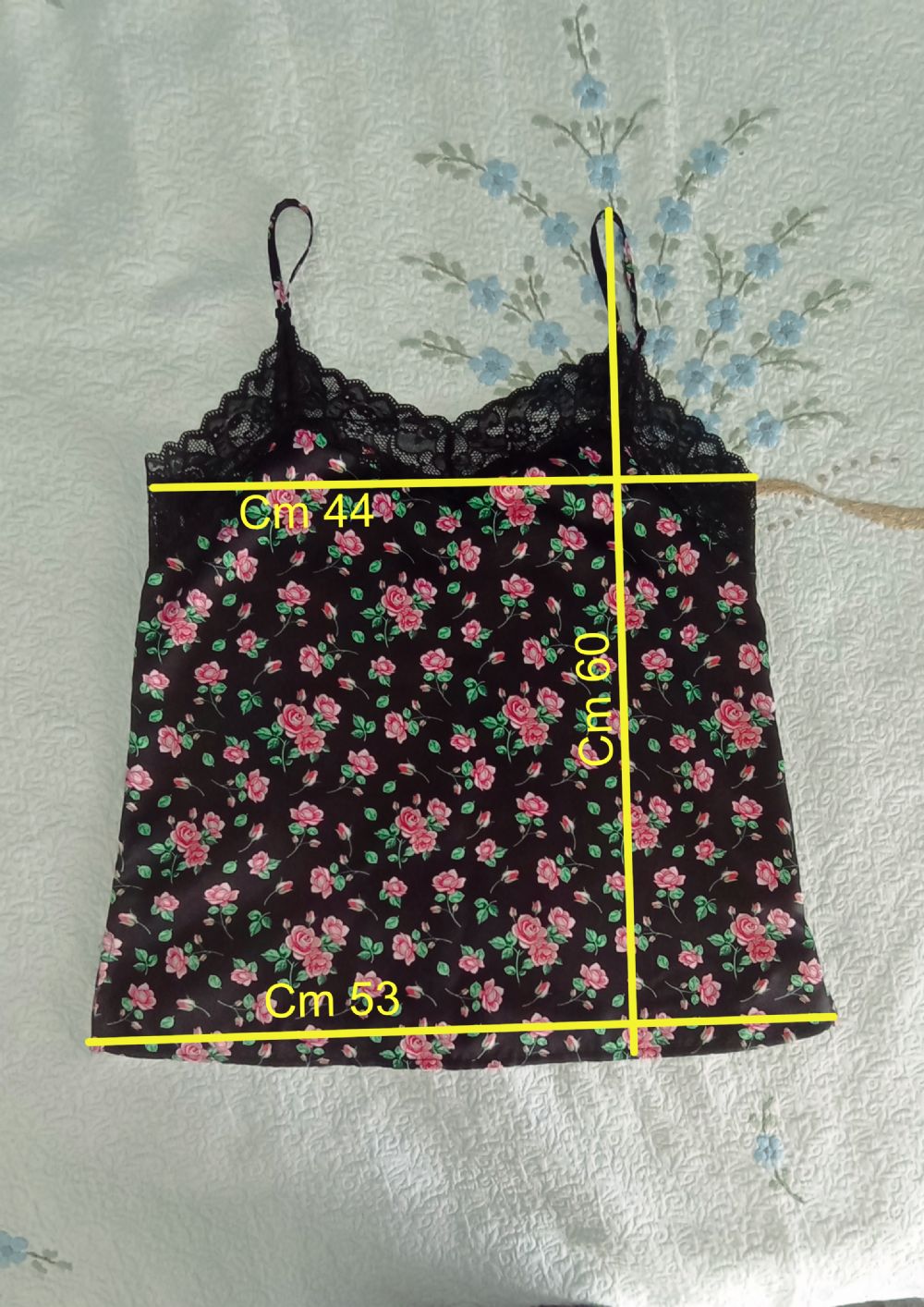 Descrizione:Canotta Tezenis in raso nero con fantasia a fiori, rifinita alla scollatura con una fascia di pizzo nero, ha spalline sottili regolabili e piccoli spacchi laterali.