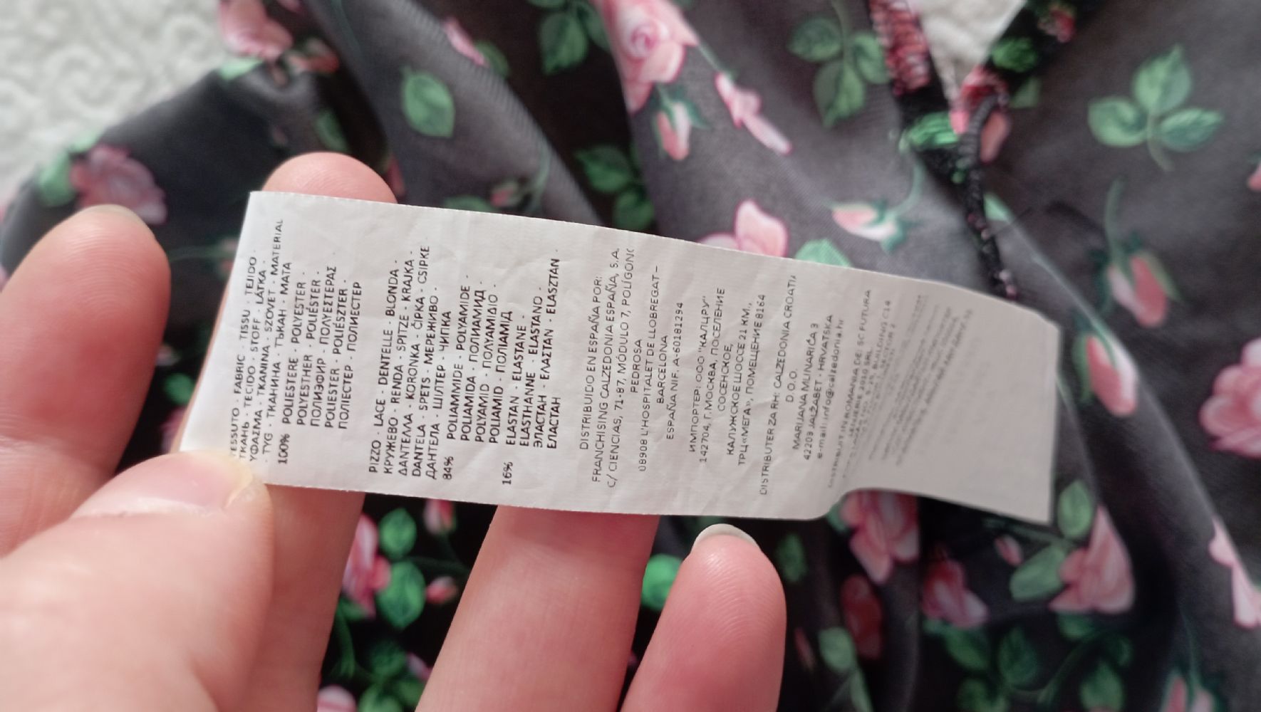 Tessuto in raso non elasticizzato 100% poliestere, pizzo in 84% poliammide e 16% elastan.