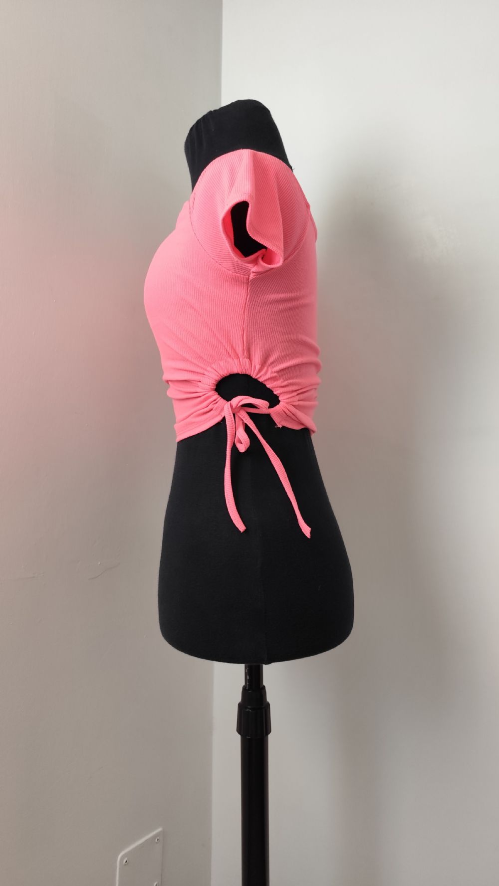 Descrizione:Top corto, t- shirt a maniche corte rosa acceso. Modello arricciato in vita con aperture circolari ai fianchi, aderente alle maniche, ha coppe preformate cucite all’interno della fodera, può essere indossato senza reggiseno, tessuto in jersey a costine. Colore più acceso rispetto alle foto, più simile alle ultime. In perfetto stato, senza difetti.