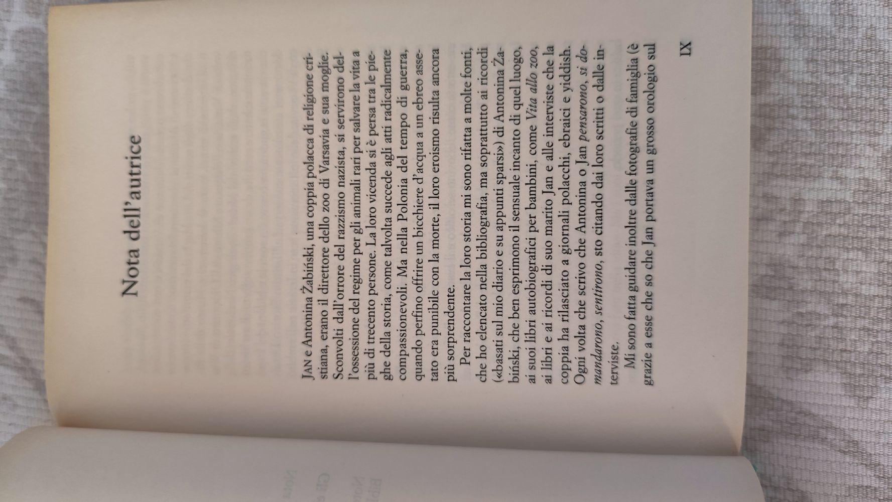 "Ho fatto solo il mio dovere. Se puoi salvare la vita di qualcuno, è tuo dovere provarci." Con questa semplicità disarmante Jan Zabiriski, direttore dello zoo di Varsavia negli anni della seconda guerra mondiale, ha parlato della straordinaria impresa grazie alla quale lui e la moglie Antonina sottrassero alla furia nazista più di trecento ebrei. È il 1939, i bombardamenti tedeschi devastano lo storico zoo della capitale polacca: Jan e Antonina reagiscono allo sgomento e salvano gli animali superstiti. Ma ben presto il razzismo nazista si accanisce sugli uomini: quando iniziano i pogrom contro gli ebrei, i due coniugi non esitano a trasformare lo zoo in un rifugio per i perseguitati, creando un mondo alla rovescia in cui gli "ospiti" segreti vengono chiamati con il nome in codice degli animali di cui occupano la gabbia vuota, mentre le bestie portano nomi di persona. Al disprezzo per chi è diverso e alla follia di voler imporre alla natura un disegno mitomane, Jan e Antonina oppongono il rispetto per gli esseri viventi, che siano animali in pericolo o ebrei polacchi, "uomini in via d'estinzione". Basandosi sul diario di Antonina e su molte altre fonti storiche, l'autrice ha recuperato dall'oblio una storia vera di coraggio e compassione.