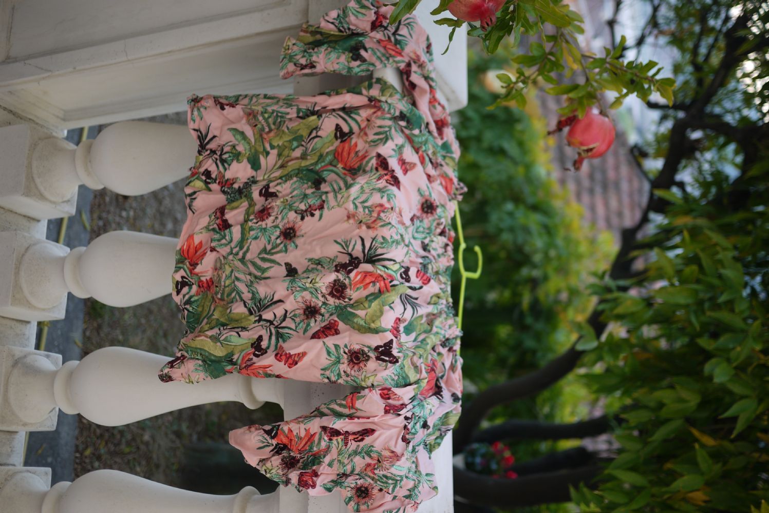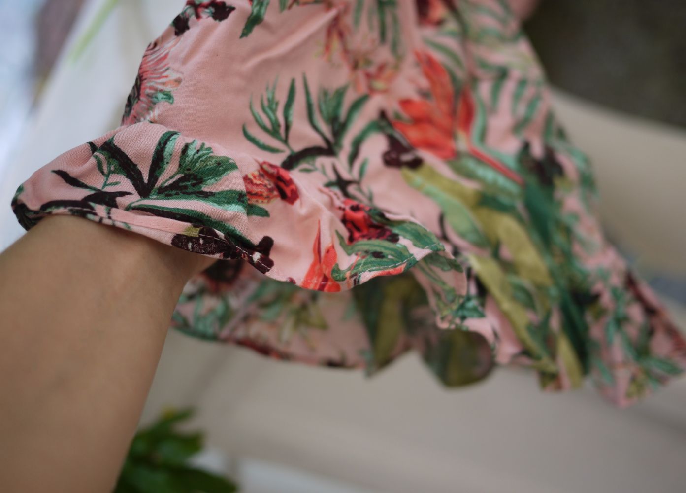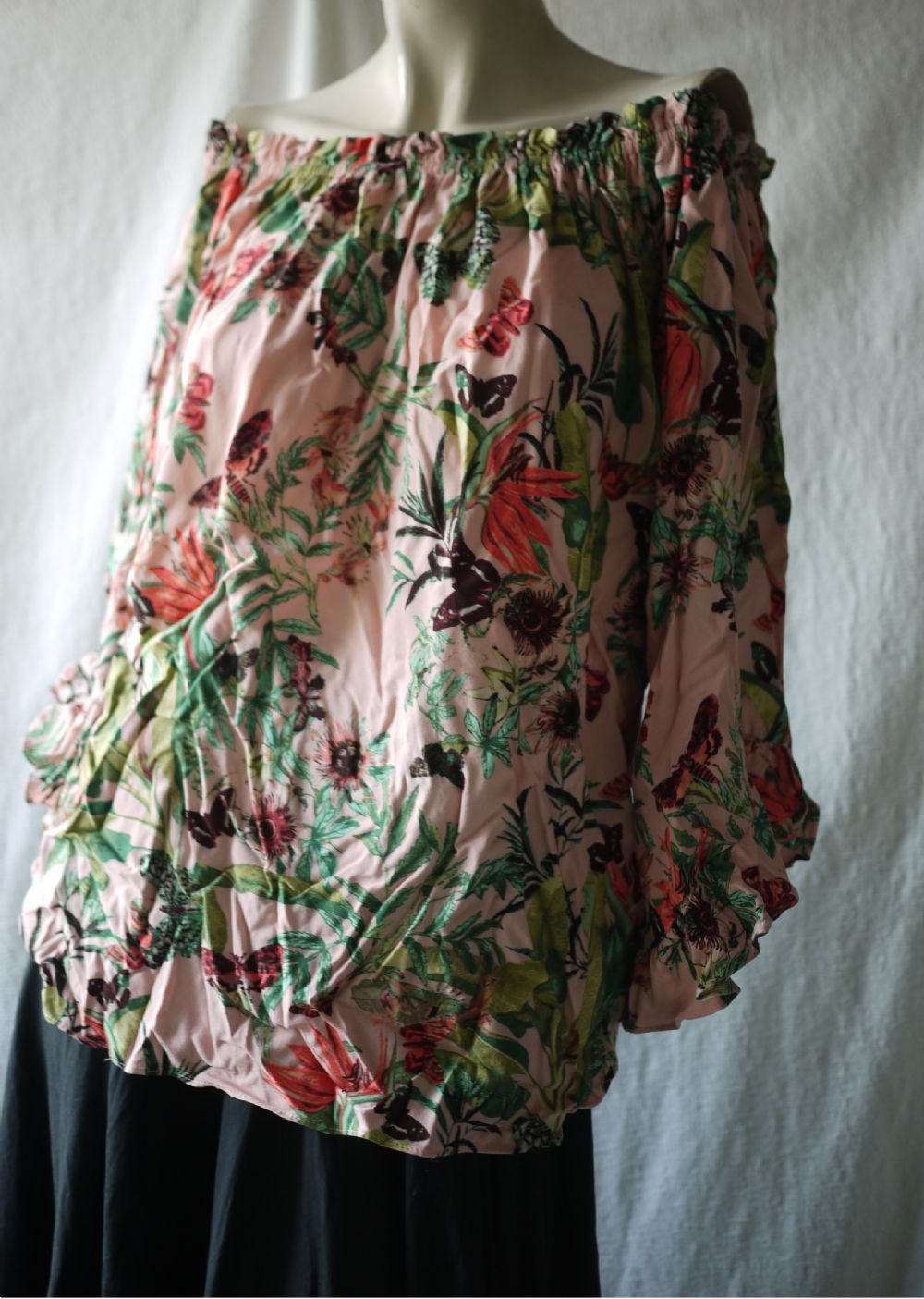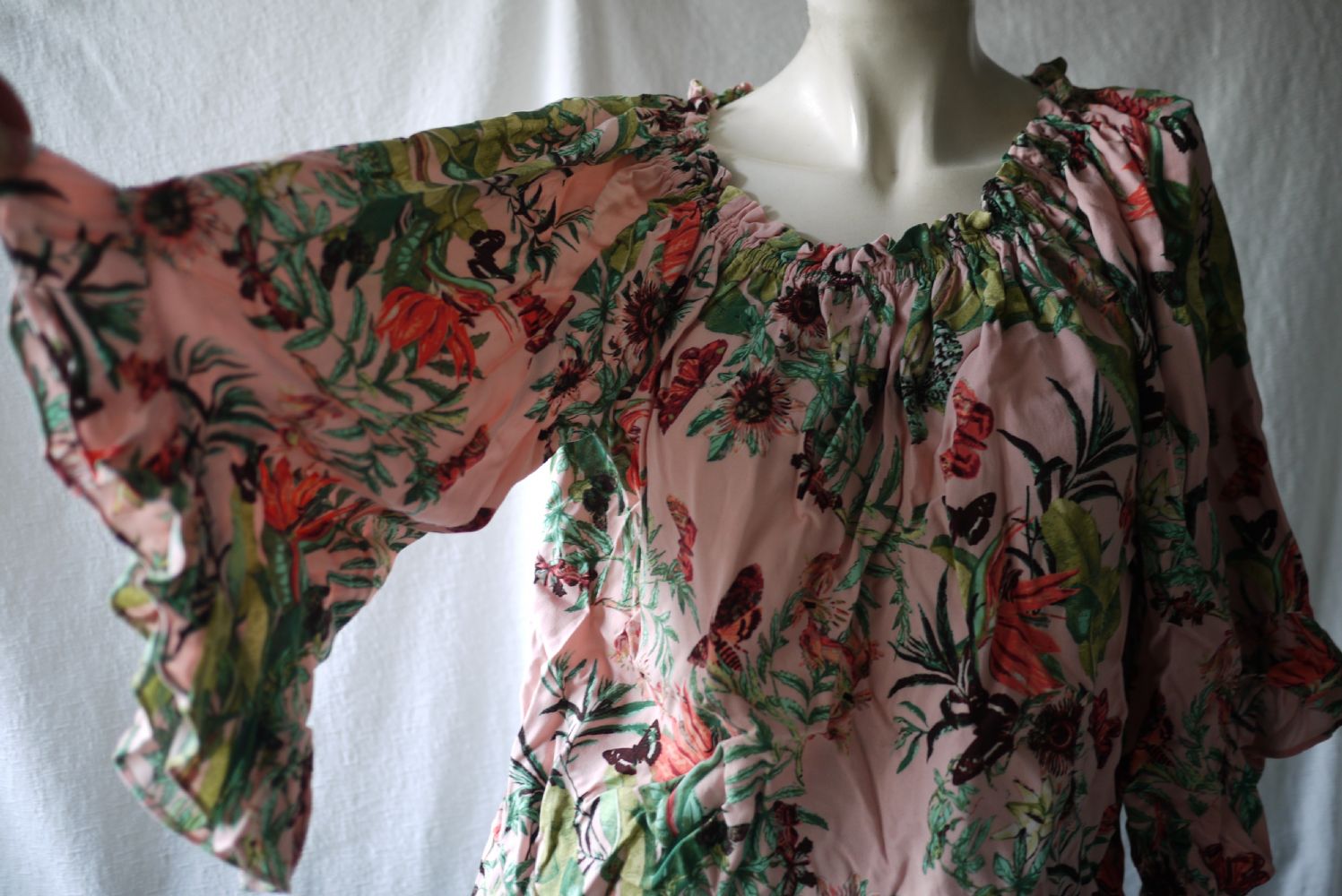 Descrizione:Camicetta fondo rosa pesca, fiori farfalle