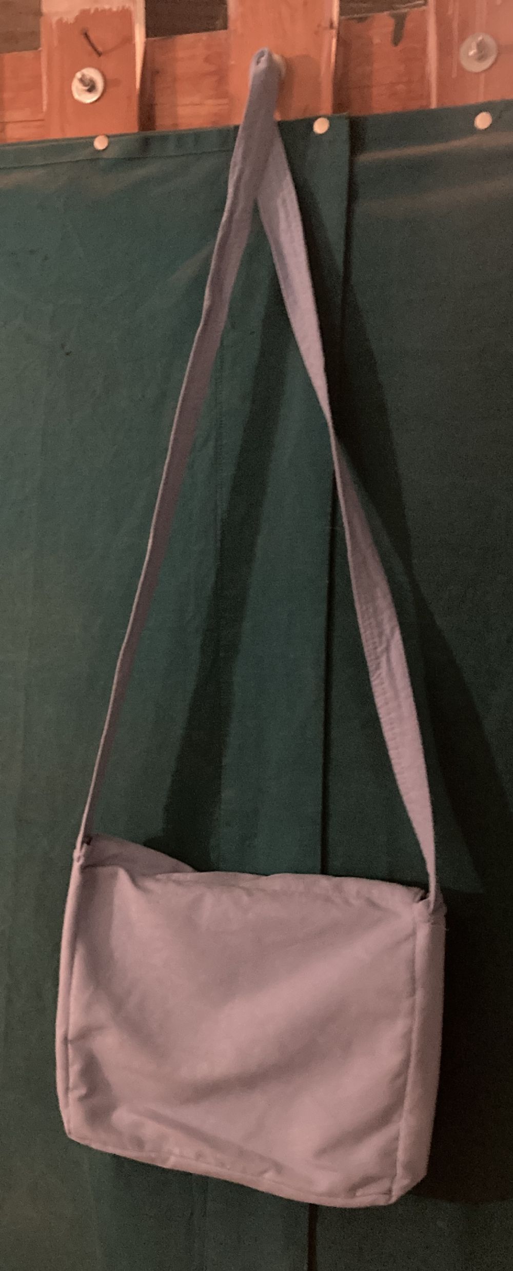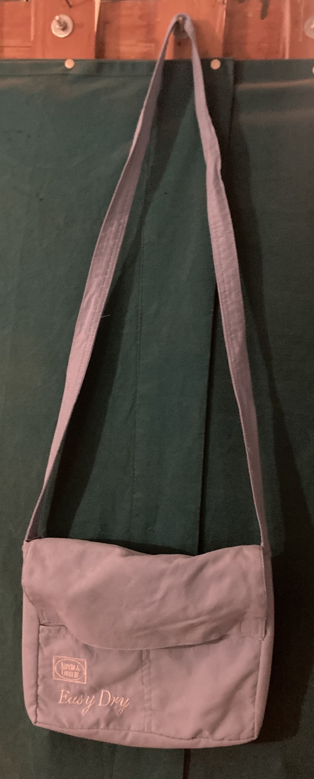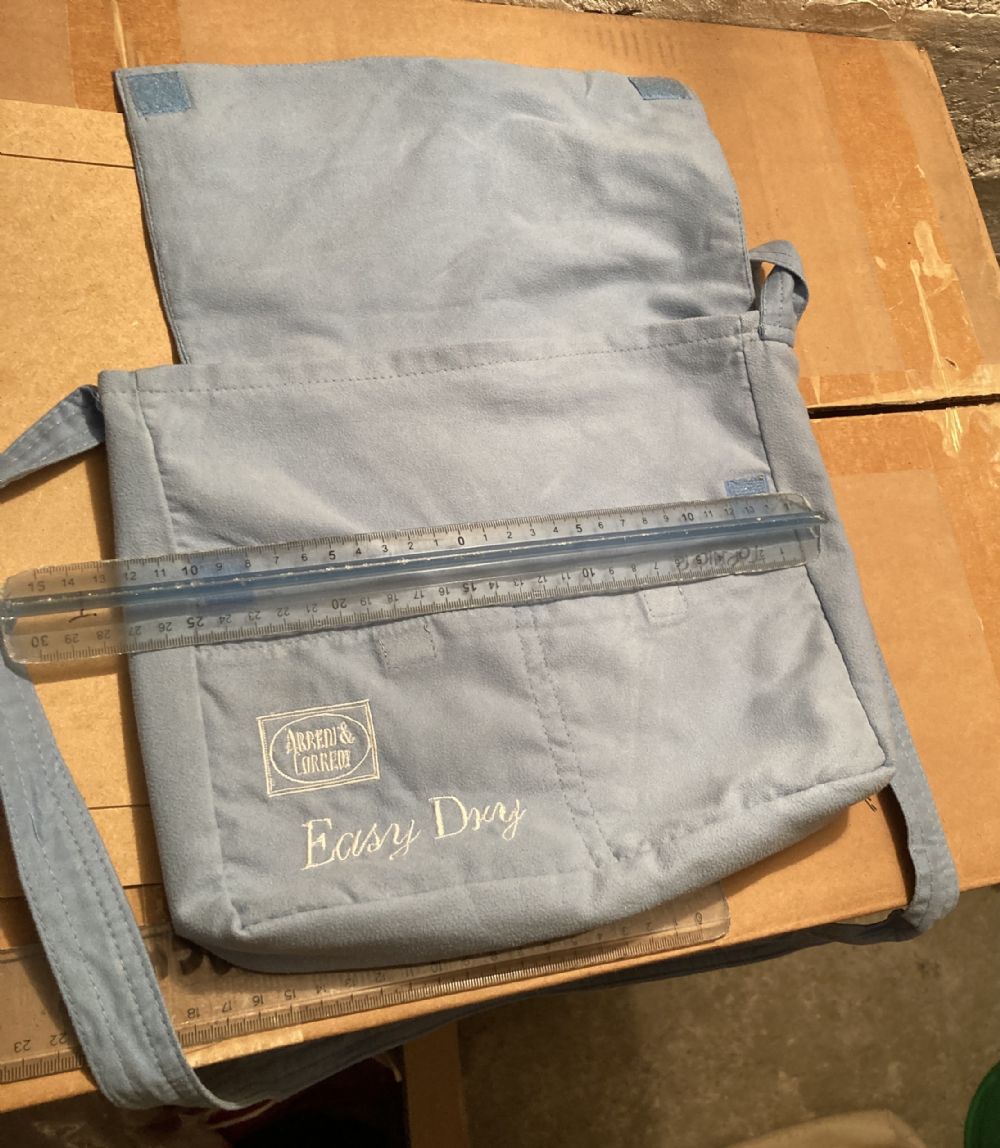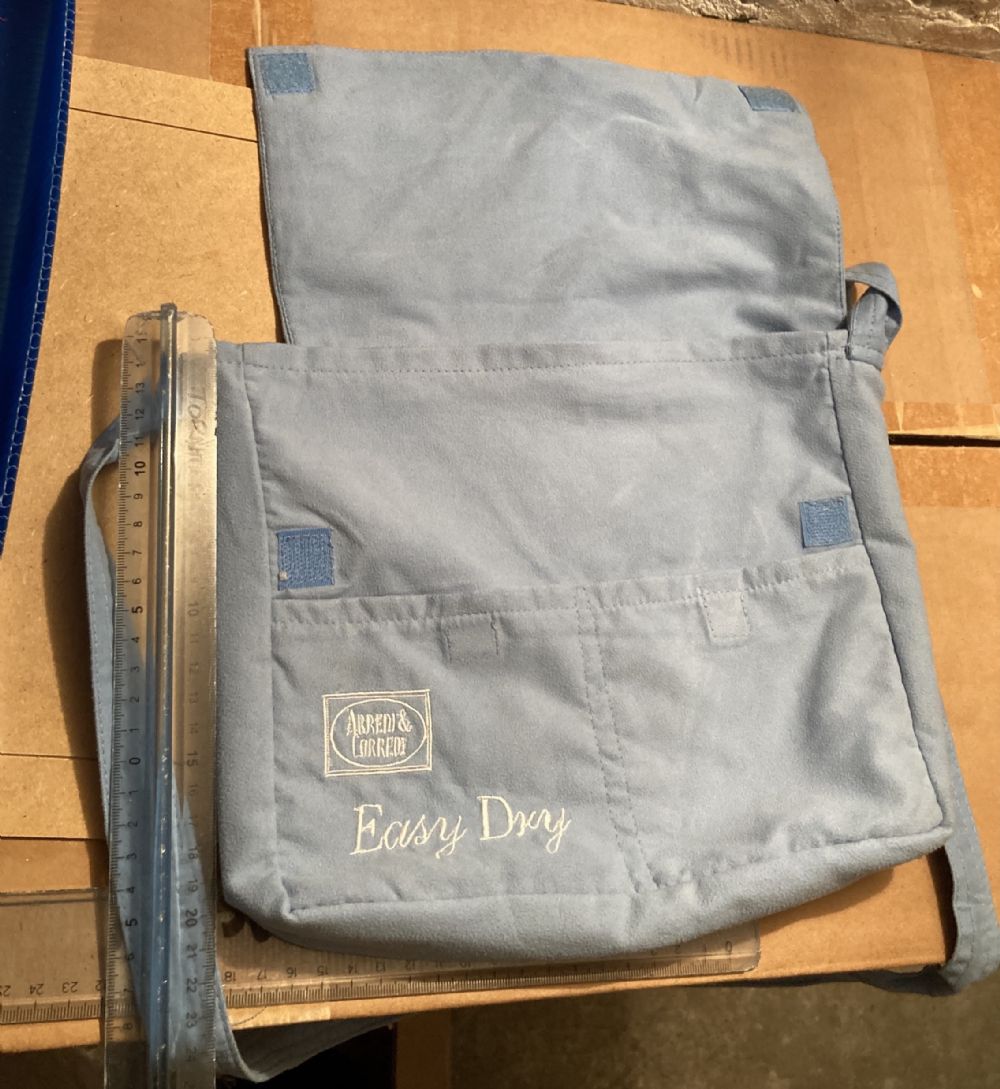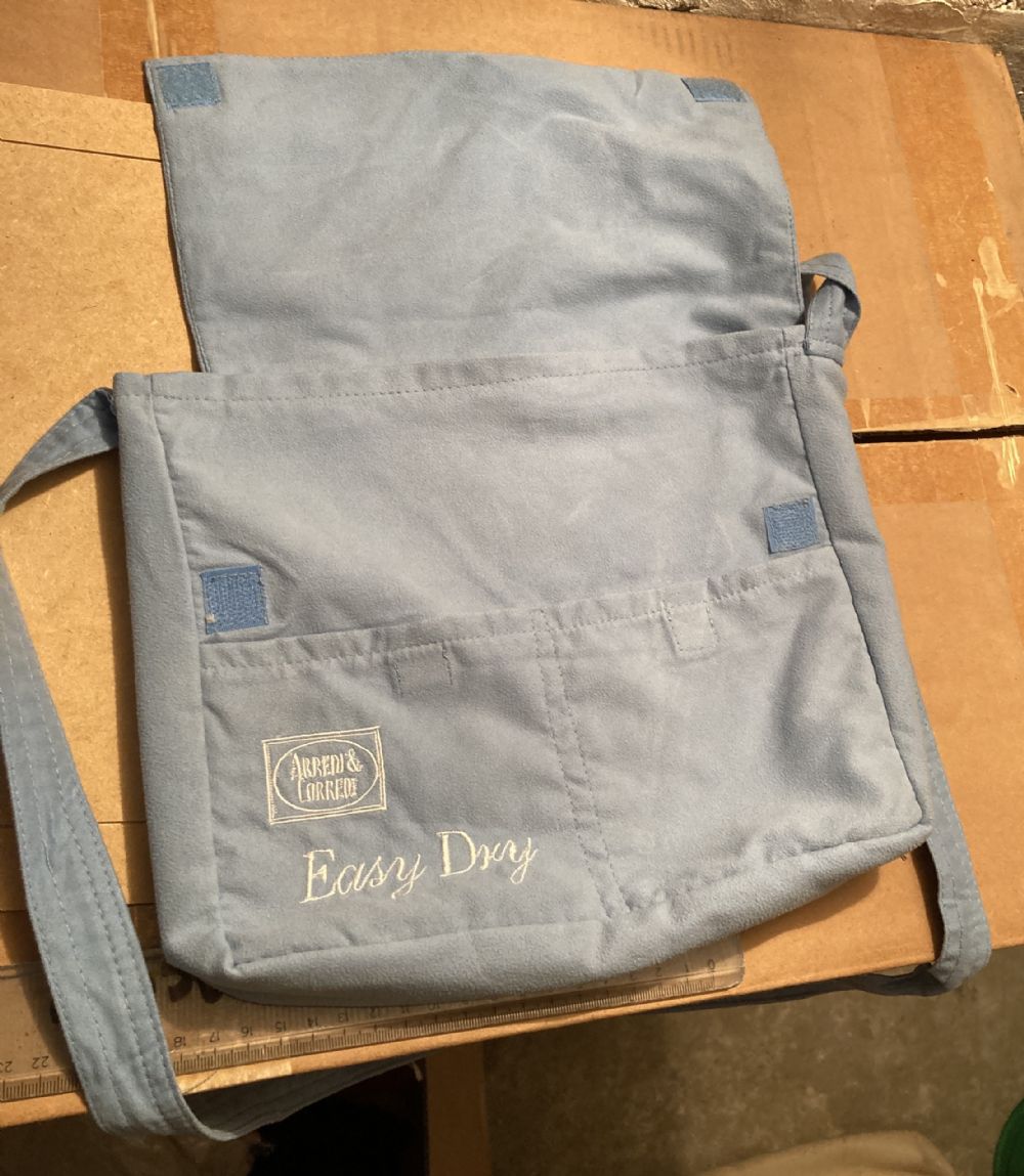 Descrizione:Borsa a tracolla in tessuto celeste, con chiusura a patta e tasche frontali. - Logo ARREDI & CORREDI ricamato. - Scritta Easy Dry ricamata.