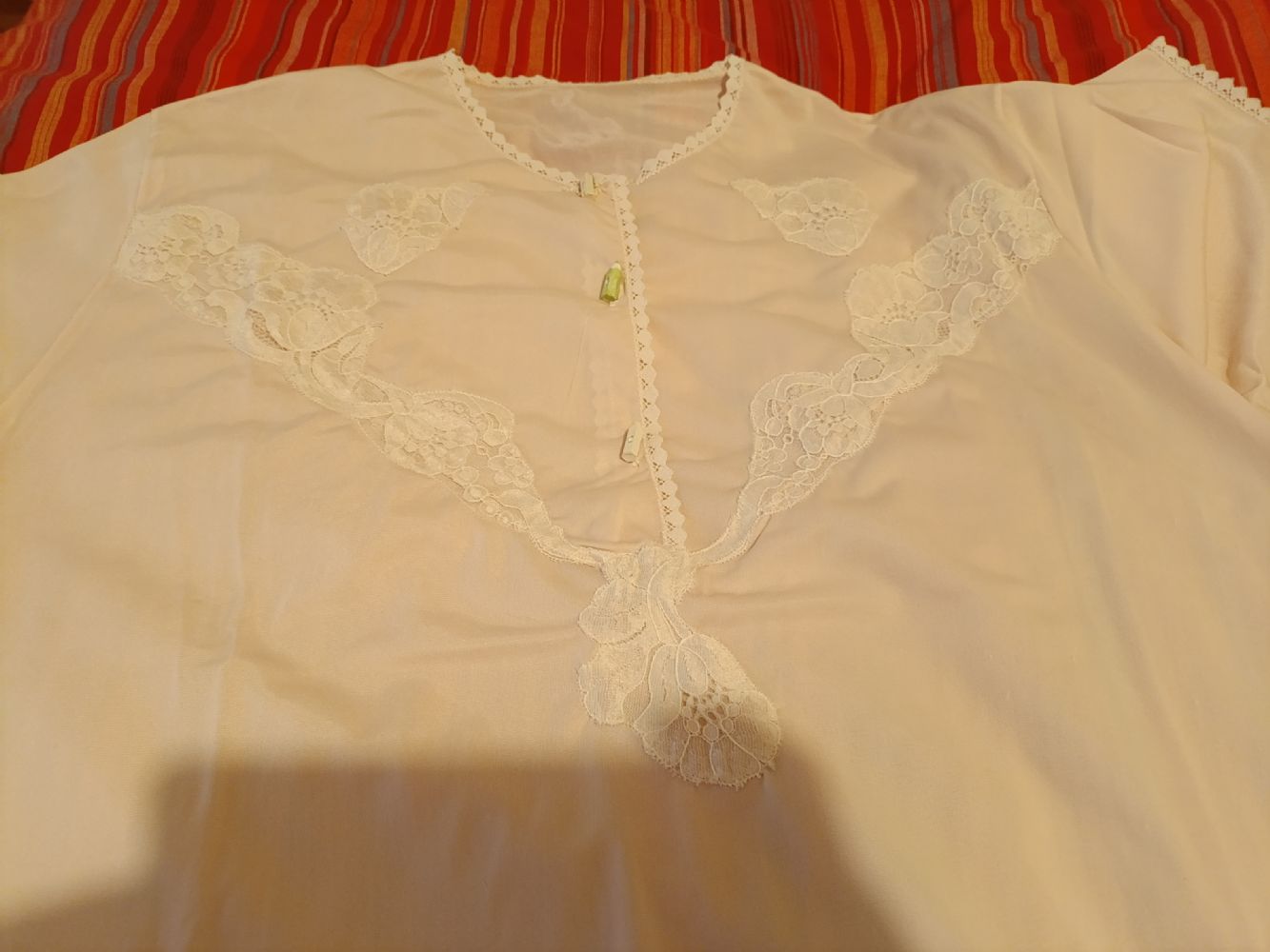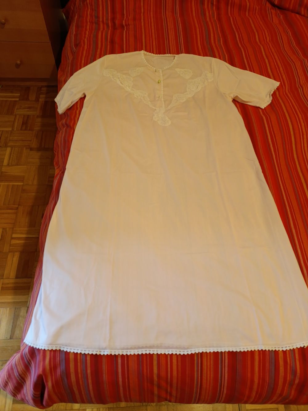 Descrizione:Camicia da notte rosa pallido (in foto sembra bianca ma non lo è, ma la giornata piovosa non mi aiuta con le foto...), in tessuto sintetico (non so quale), se l'era cucita mia nonna per se stessa (anni Sessanta), i bottoni a matitina sono invece una modifica successiva. Taglia direi 48, spalle 46, ascelle 57, lunghezza 110 cm. Come nuova o forse nuova