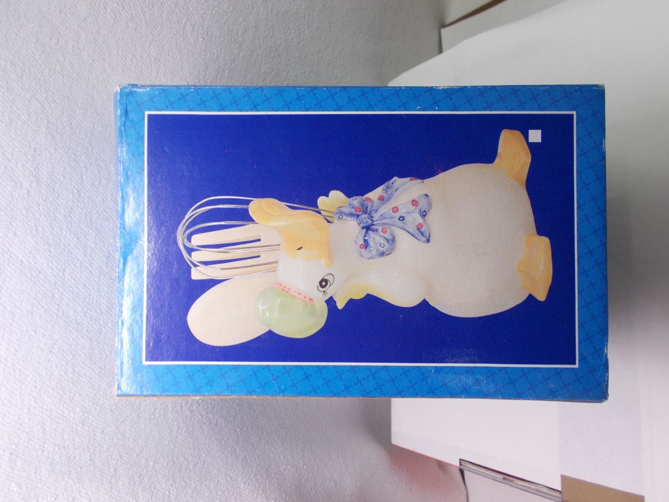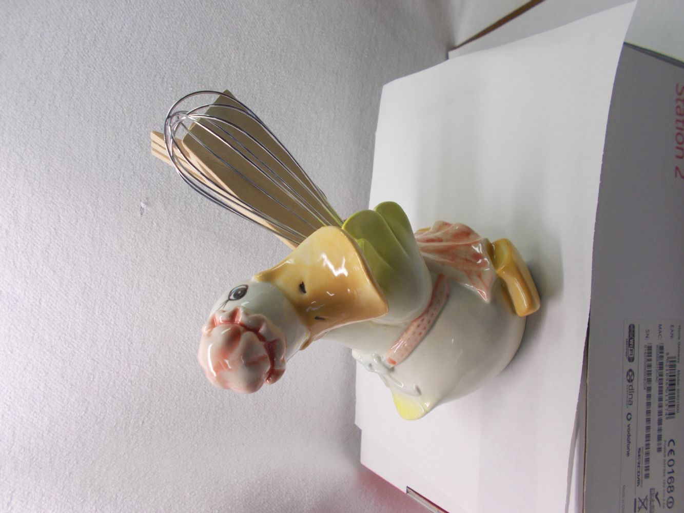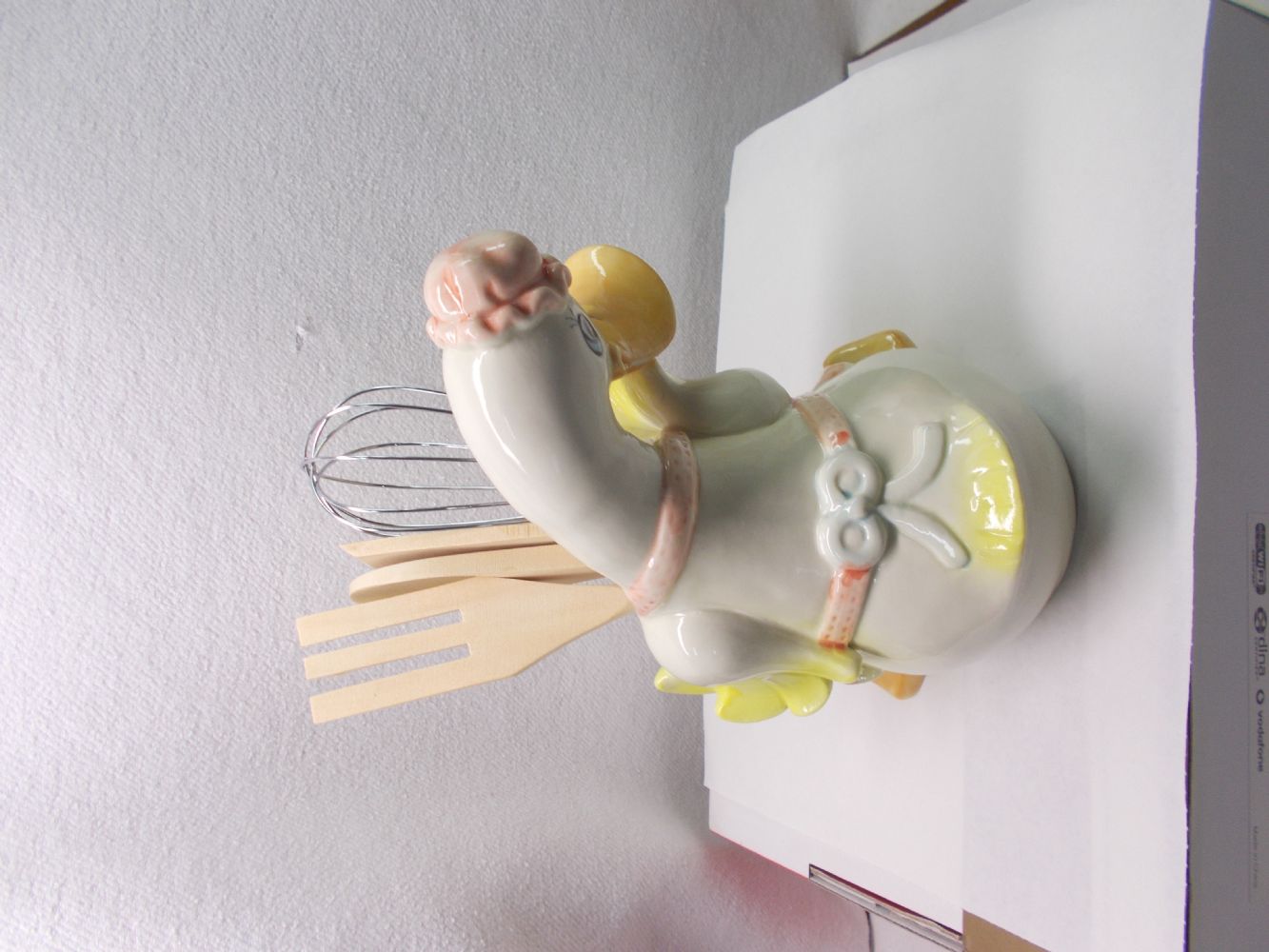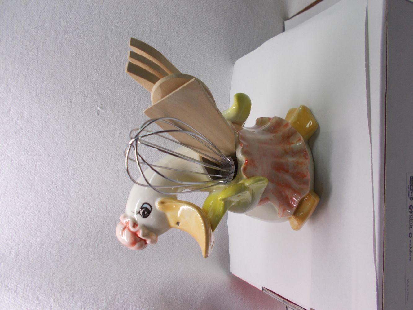 Porta attrezzi da cucina in ceramica a figura di papera completo di cucchiaio spatola forchetta in legno e frusta in acciaio