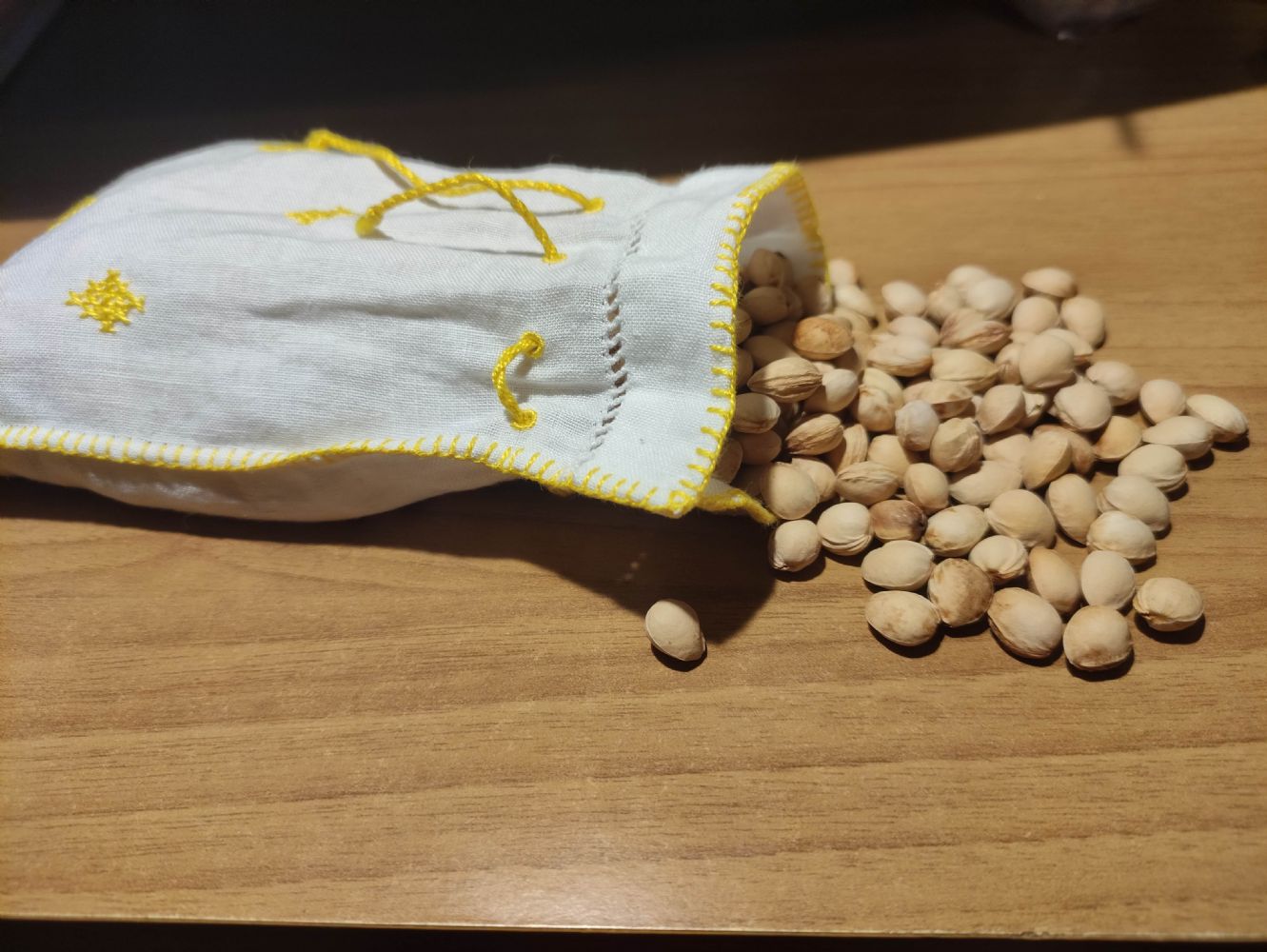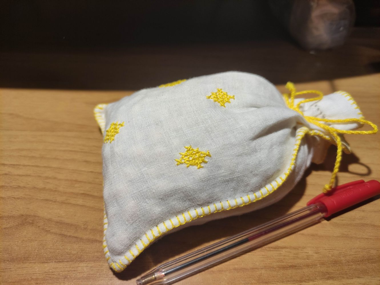 Descrizione:Il sacchetto, che è ricamato a mano, è pieno di noccioli di ciliegio lavati e fatti bollire per la sterilizzazione.