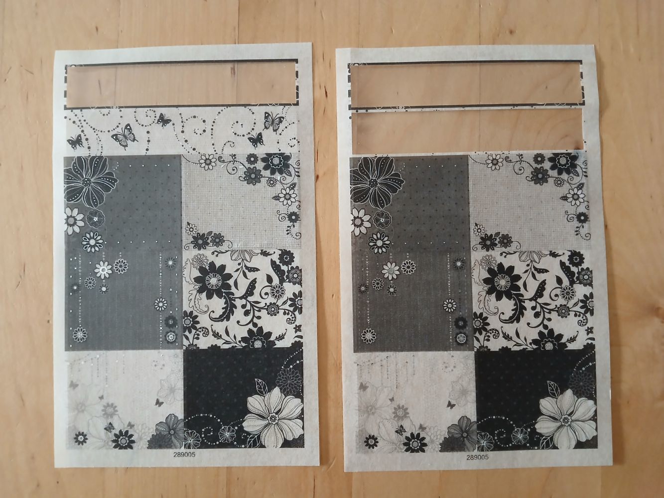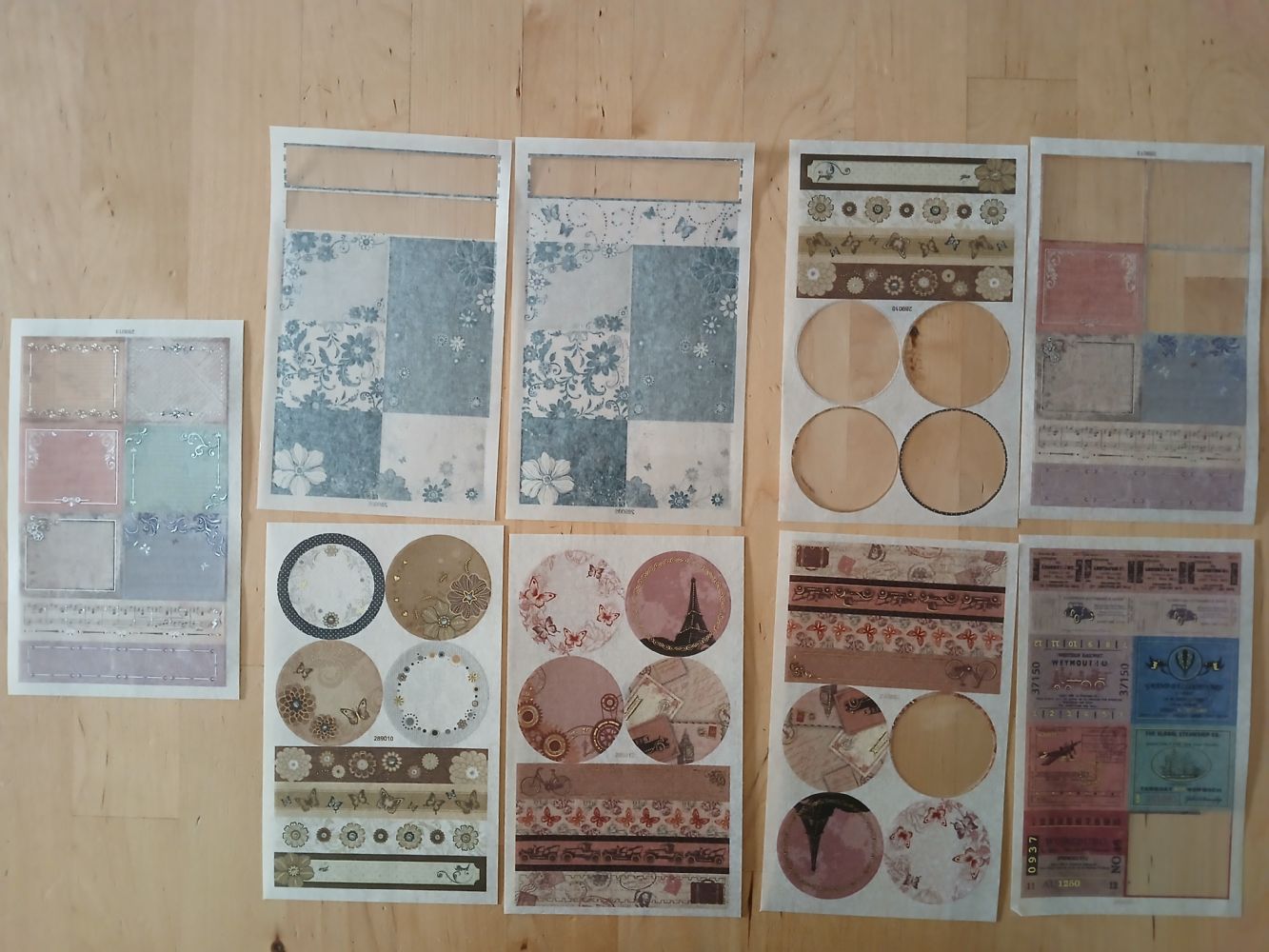 Nove fogli di adesivi, per la maggior parte iniziati.
