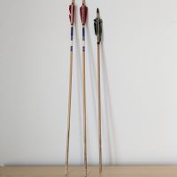 Descrizione:Sono 3 frecce per tiro con l'arco sportivo, è stata tolta la punta per un progetto creativo che poi non ha avuto seguito. Lunghezza delle due più lunghe cm 78, la terza misura cm 72