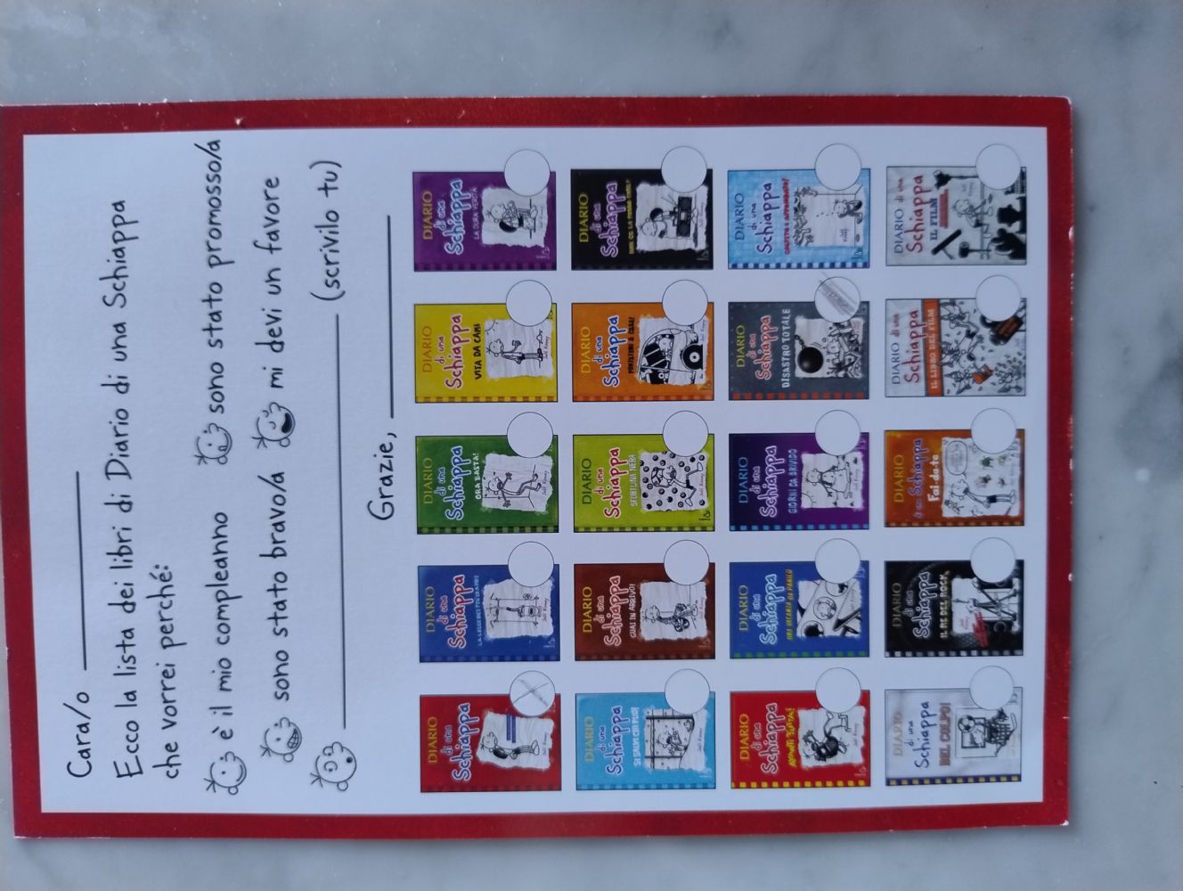 Descrizione:Cerco libri della serie Diario di una schiappa, tranne quelli segnati nella foto e Vuoto cosmico.