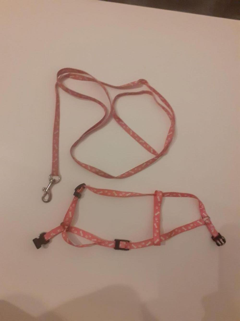 Descrizione:pettorina con guinzaglio per gatti o cani piccola taglia, comprato per il mio gatto perché volevo portarlo con me quando uscivo, ma poi messo da parte