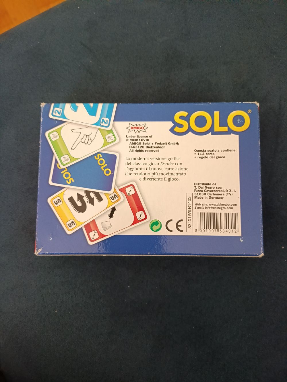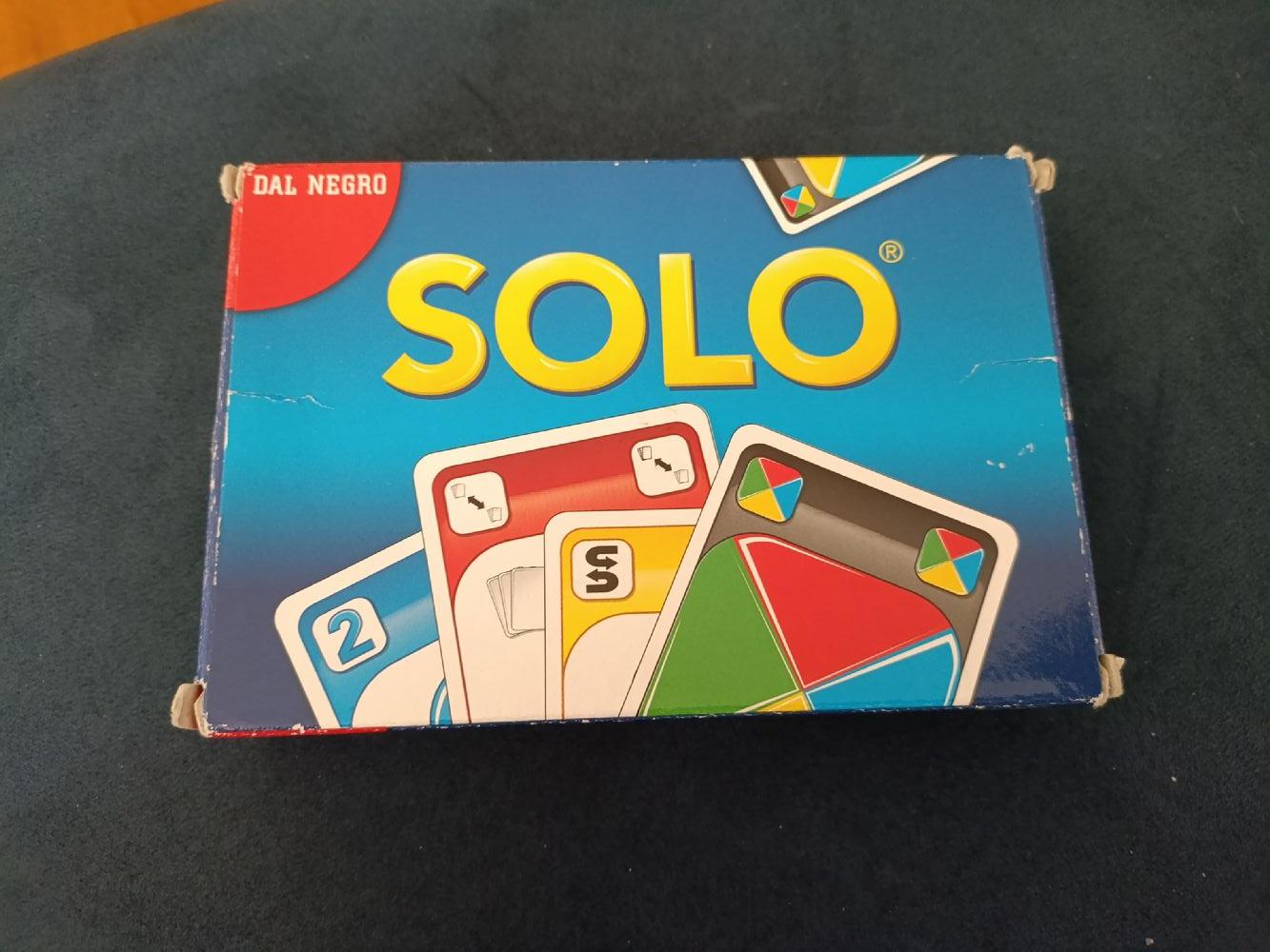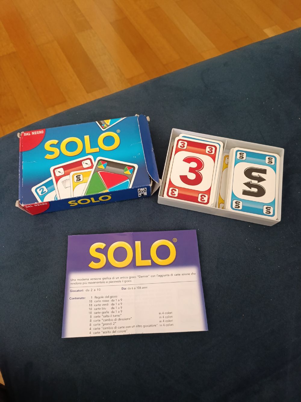 Descrizione:Gioco di carte "Solo", somiglia un po' a Uno. Mai giocato ma la scatola non è perfetta