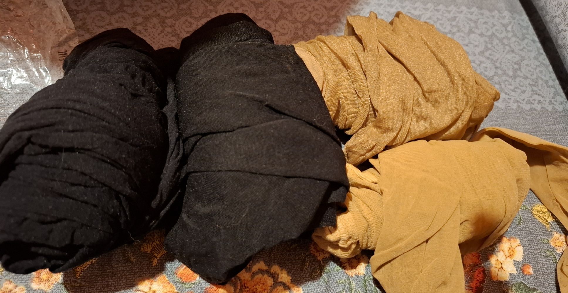 Descrizione:Non so la taglia ma credo vadano bene a una M/L visto che erano di mia suocera. Ho controllato e non mi sembra ci siano strappi, buchi etc, mi sembrano in ottimo stato.