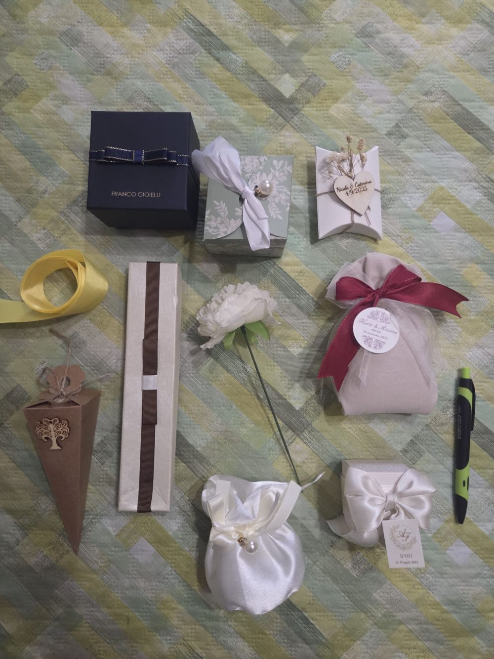 Un po' di scatole portagioielli, scatoline e sacchetti di varie forme, nastro e decorazioni dal mio scatolone fabbricone, regalo a chi scambia con me, anche separatamente