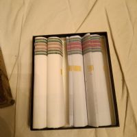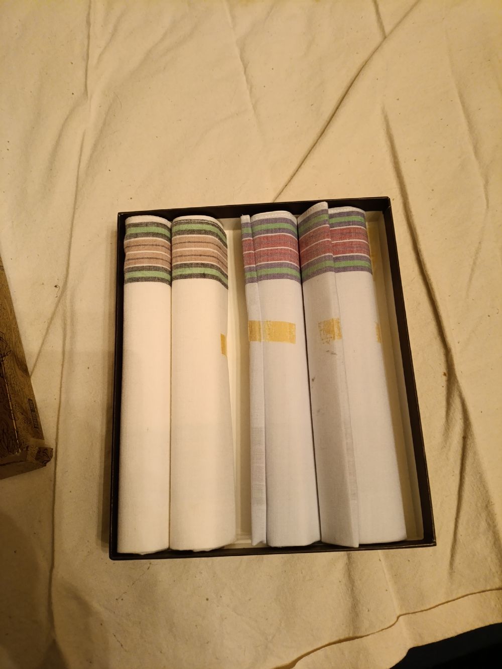 Descrizione:4 fazzoletti da uomo in puro cotone, nuovi ma decisamente vintage, hanno ancora il pezzettino di scotch per chiuderli che purtroppo ha lasciato una macchiolina gialla (vedi foto),non ho provato a lavarli