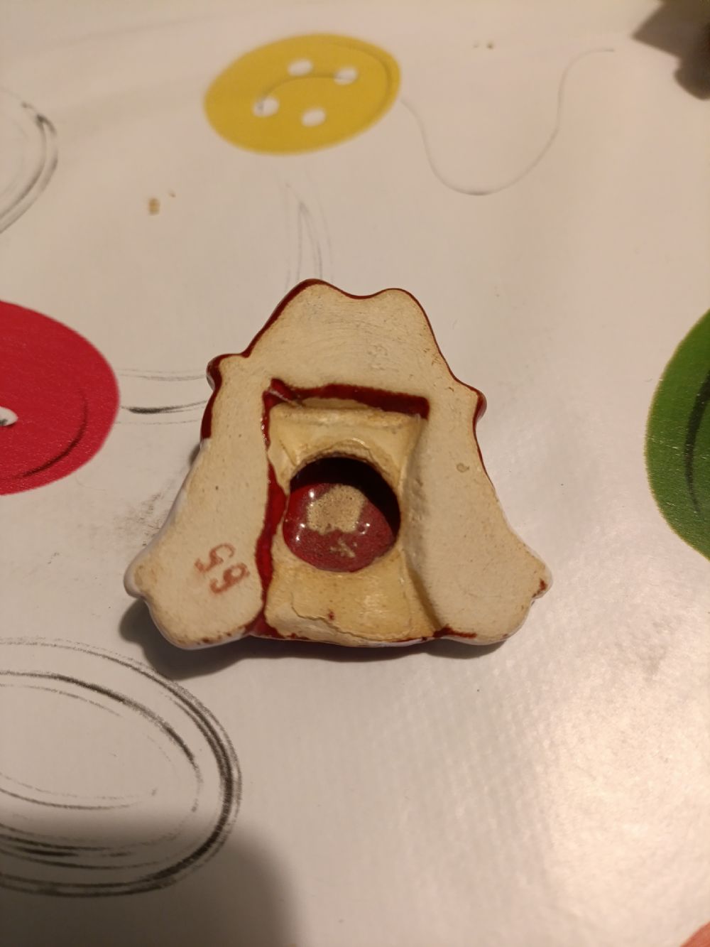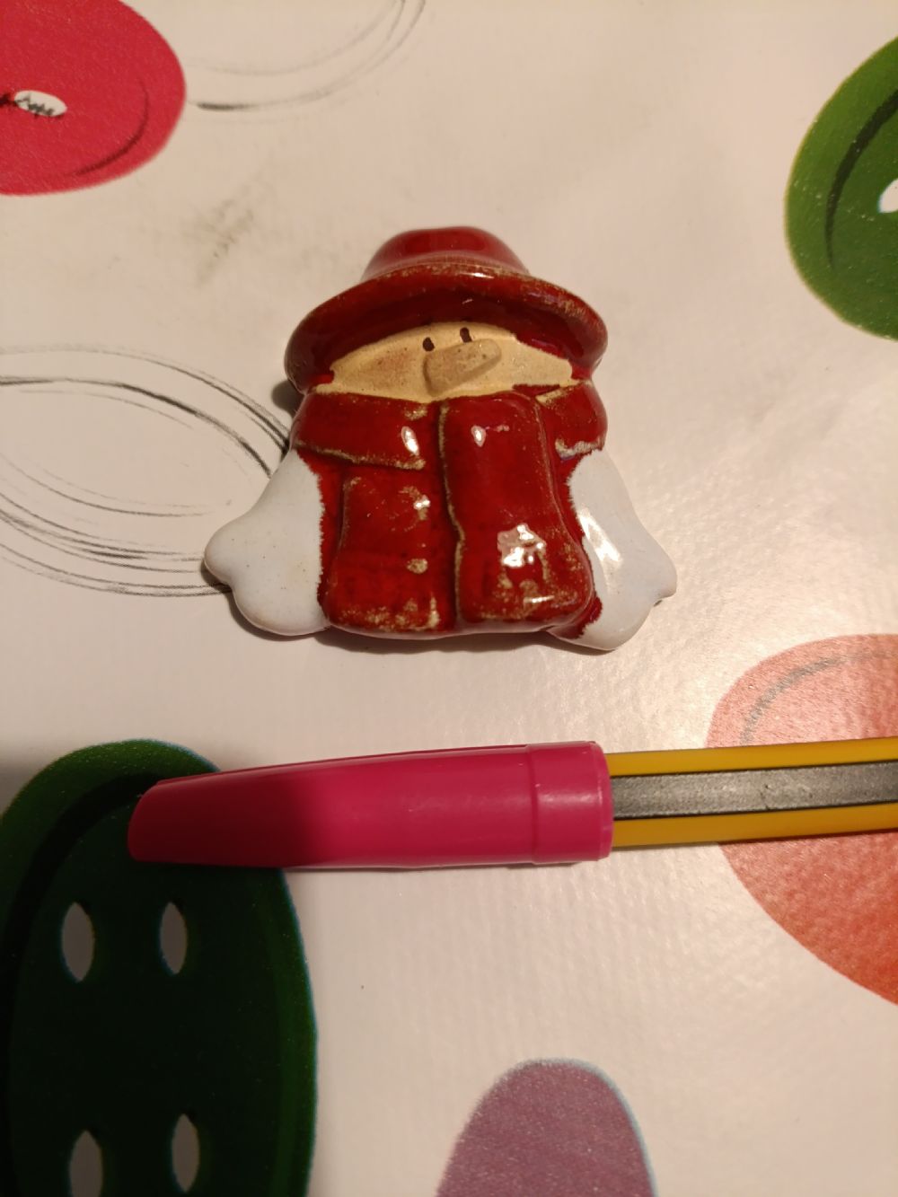 Descrizione:Decorazione in ceramica a forma di pupazzo di neve, dietro ha una scanalatura e un buco, forse per attaccare una calamita o altro... vedete voi