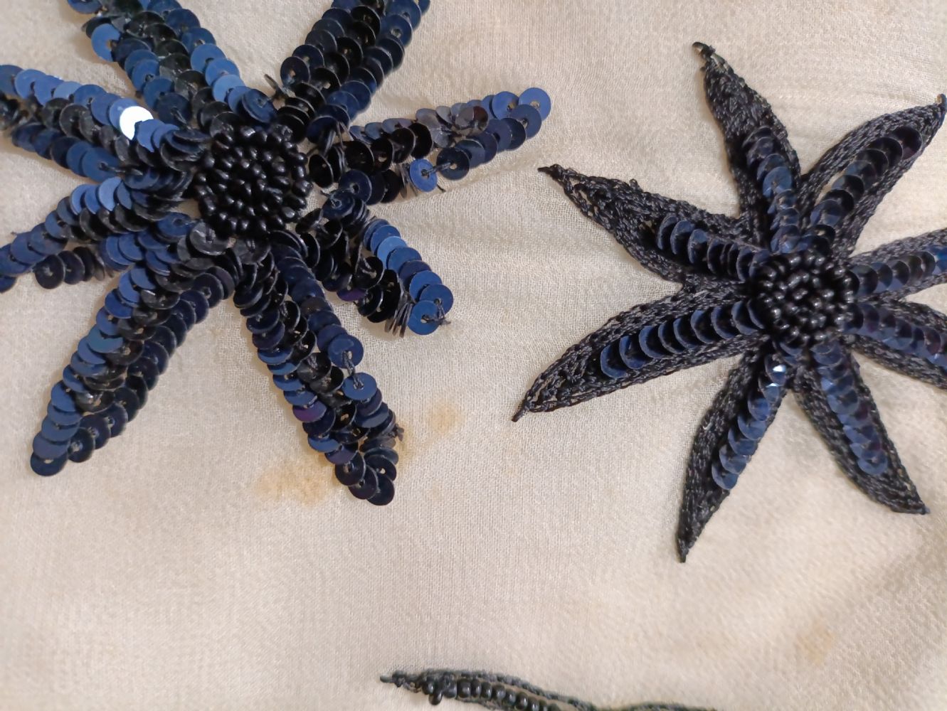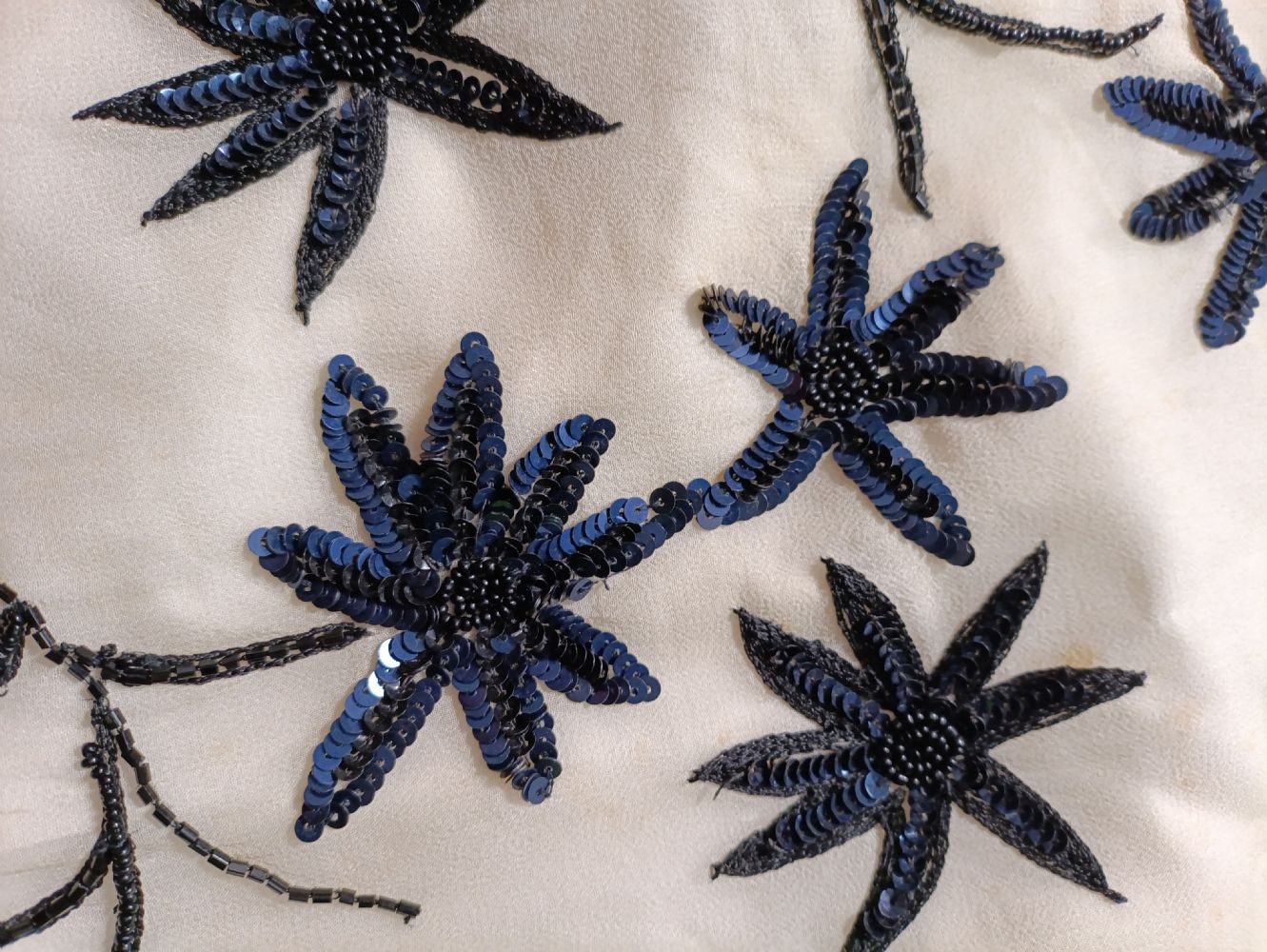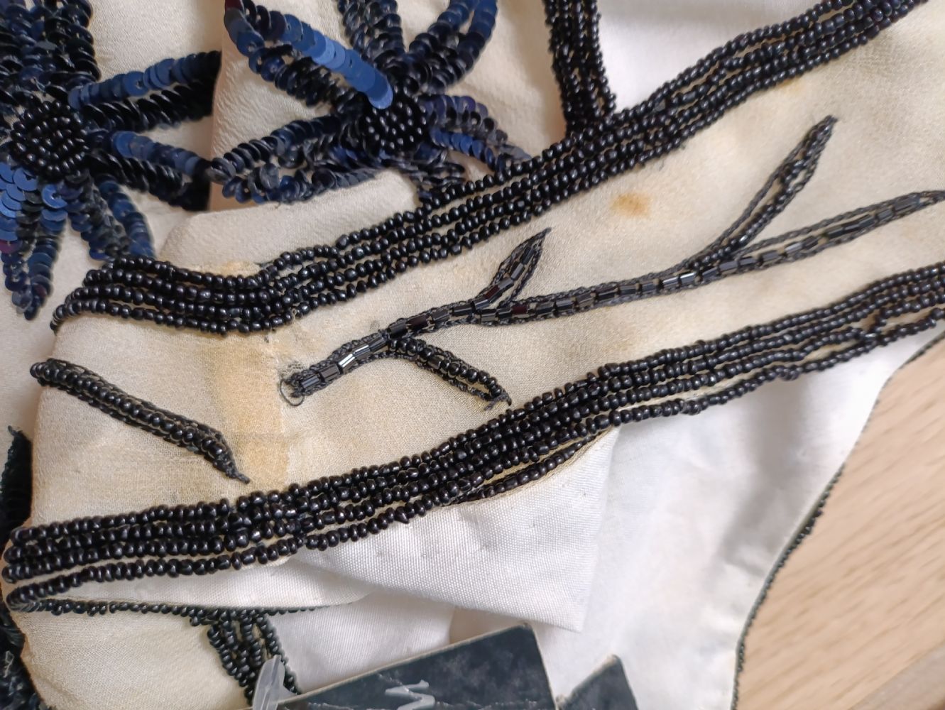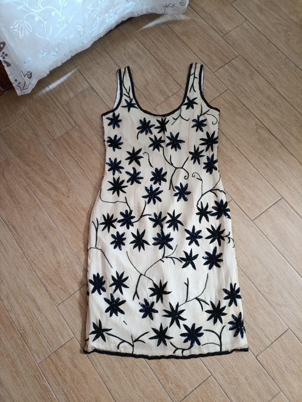 Descrizione:Vestito interamente ricamato con perline e paillettes, mai indossato e ancora con il cartellino, ma fermo da anni in un armadio, quindi ha alcune macchioline gialle (non ho provato a toglierle) e in alcuni punti il ricamo va ripreso. Taglia indicata 38, lunghezza 90, ascelle 40, vita 37, fianchi 44 cm. Seta 100% con fodera interna in poliestere e viscosa. Prezzo sul cartellino 80 euro