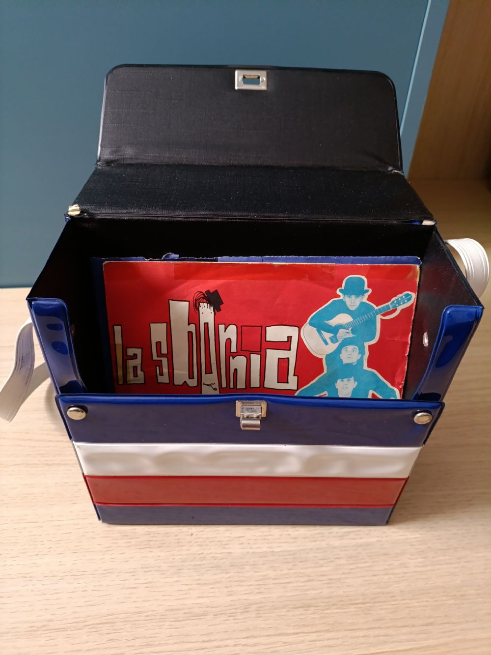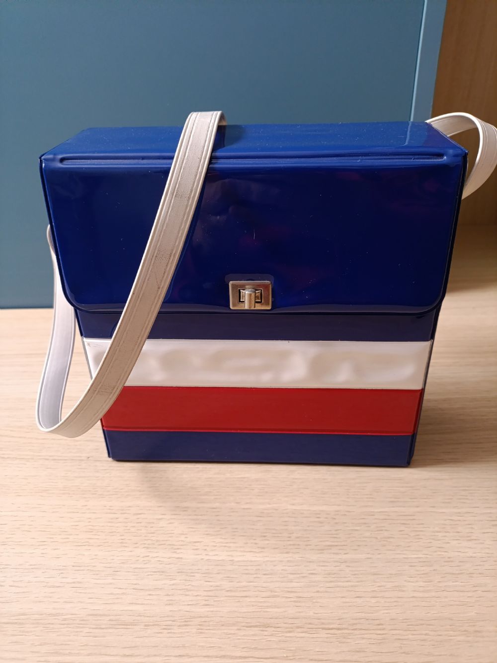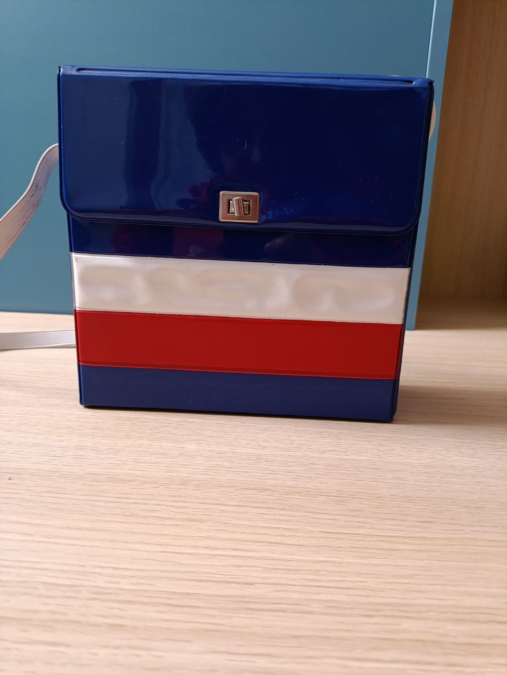 Descrizione:Borsa/scatola contenitore per dischi 45 giri, very vintage (era mia), tenuta benissimo e molto funzionale. 20x20x8 cm, in cartone rivestito in plastica lucida, con tracolla per il trasporto.